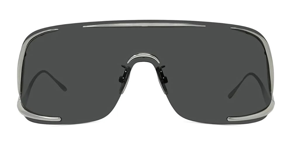 This shield Loewe sunglass comes in a silver frame with grey lenses.