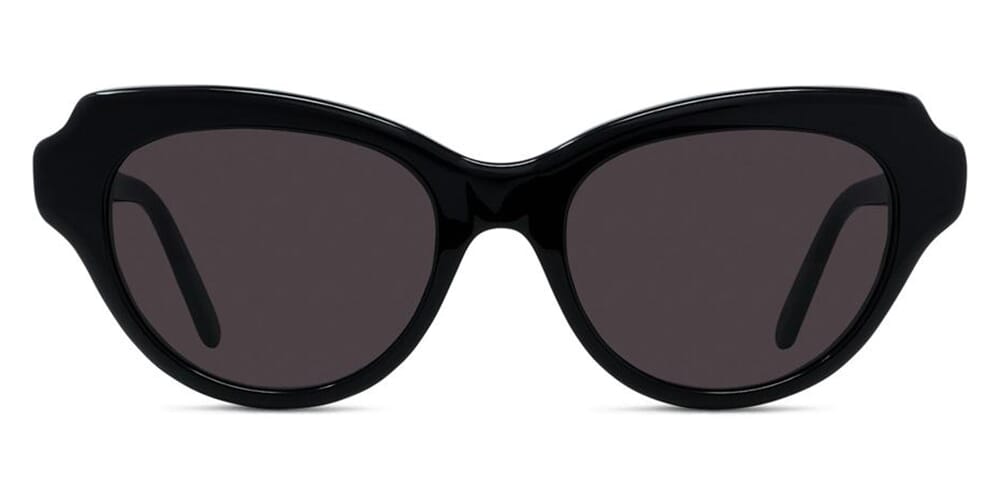 This cat eye Loewe sunglass comes in a shiny black frame with grey with light mirror lenses.