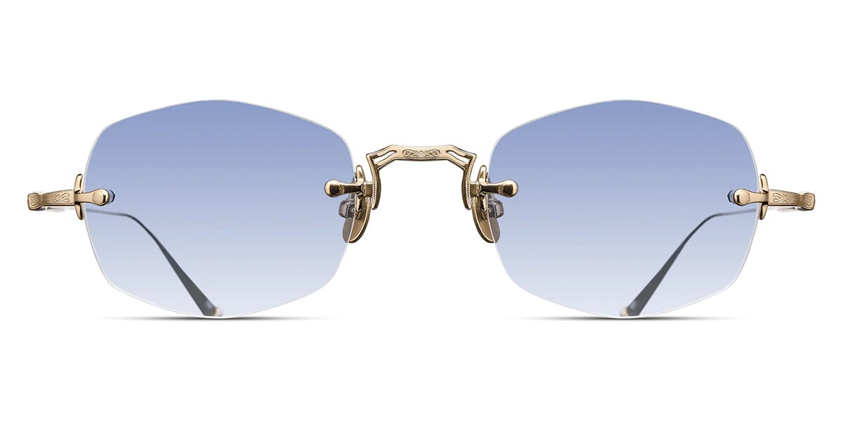 This round Matsuda sunglass comes in a brushed gold frame with blue gradient with light mirror lenses.