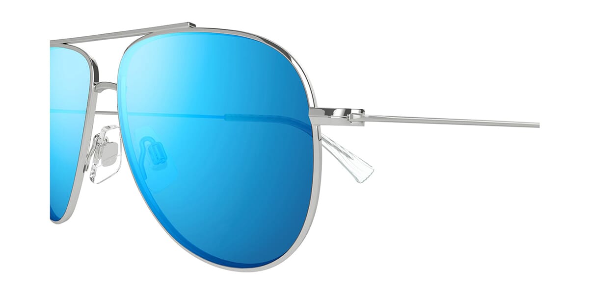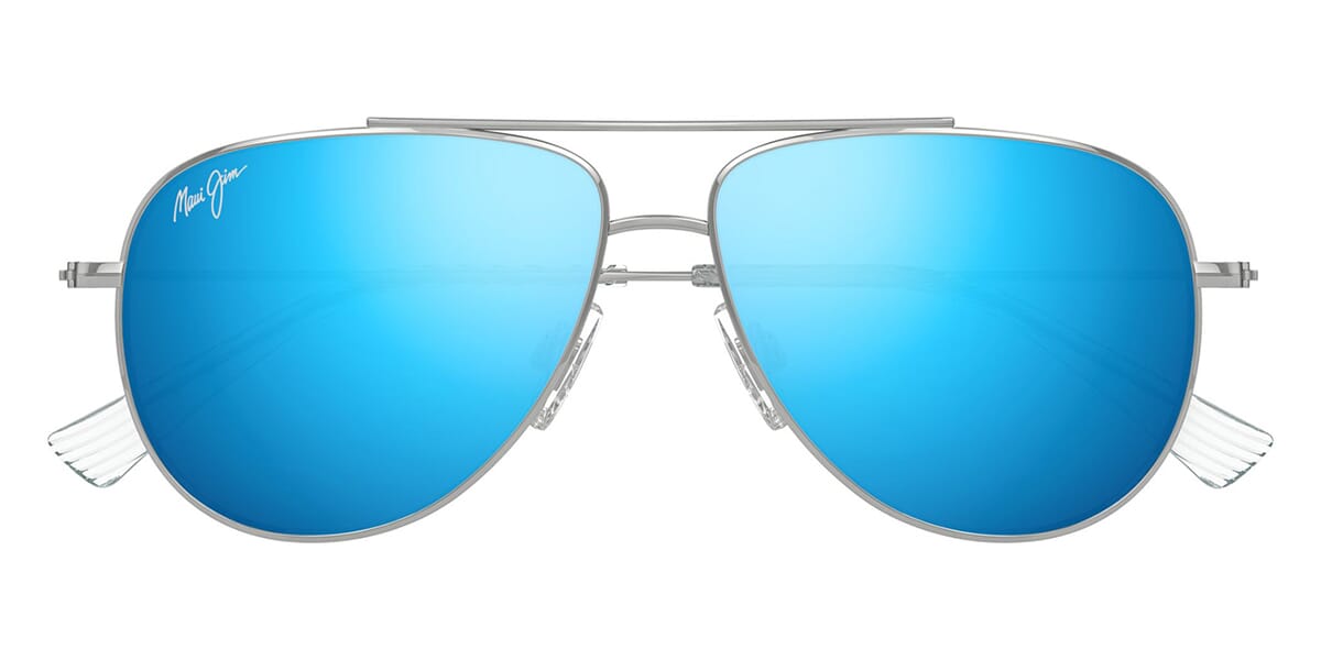 This aviator Maui Jim sunglass comes in a shiny silver with crystal frame with maui pure blue hawaii lenses.