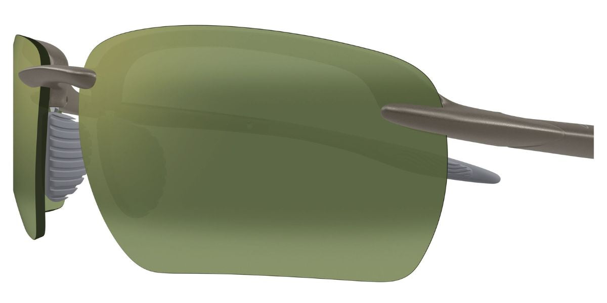This square Maui Jim sunglass comes in a metal matte grey frame with ht green photochromic maui ultra with white flash mirror lenses.