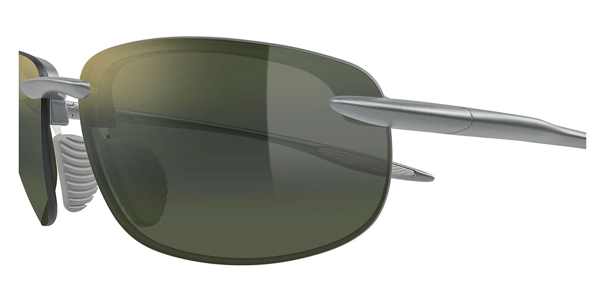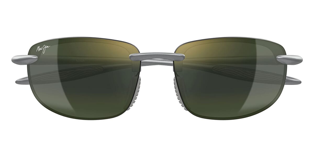 This wraparound Maui Jim sunglass comes in a grey frame with maui ht green maui ultra photochromic lenses.