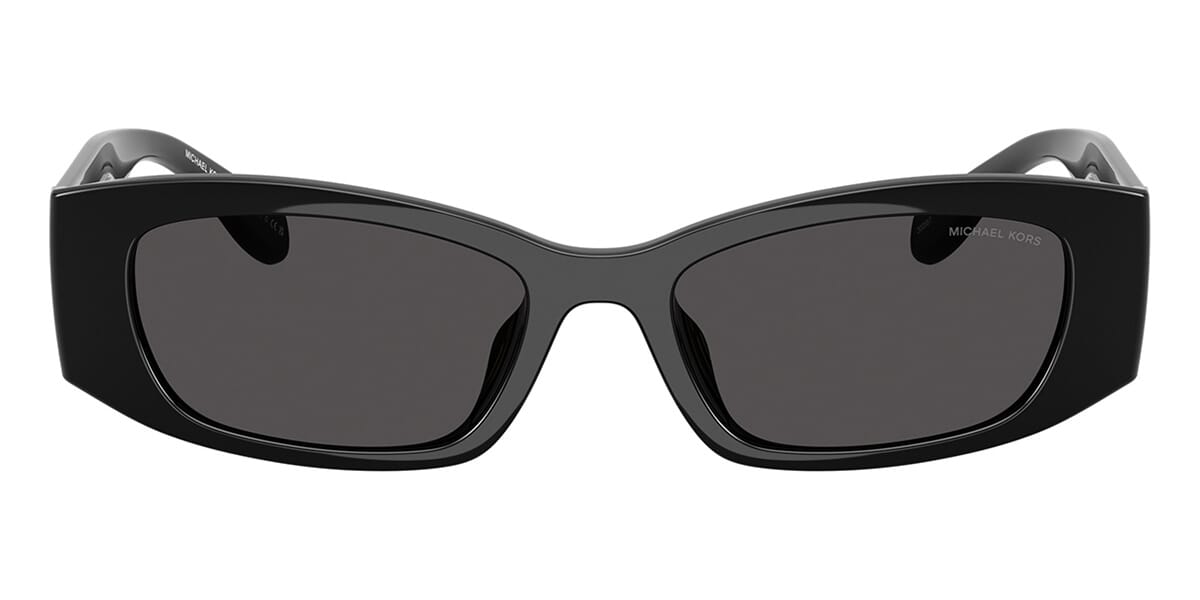 This rectangular Michael Kors sunglass comes in a black frame with dark grey solid lenses.