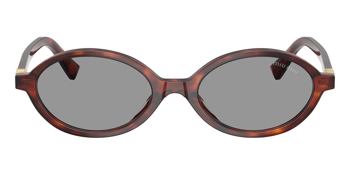 This round Miu Miu sunglass comes in a havana mahogany frame with grey lenses.