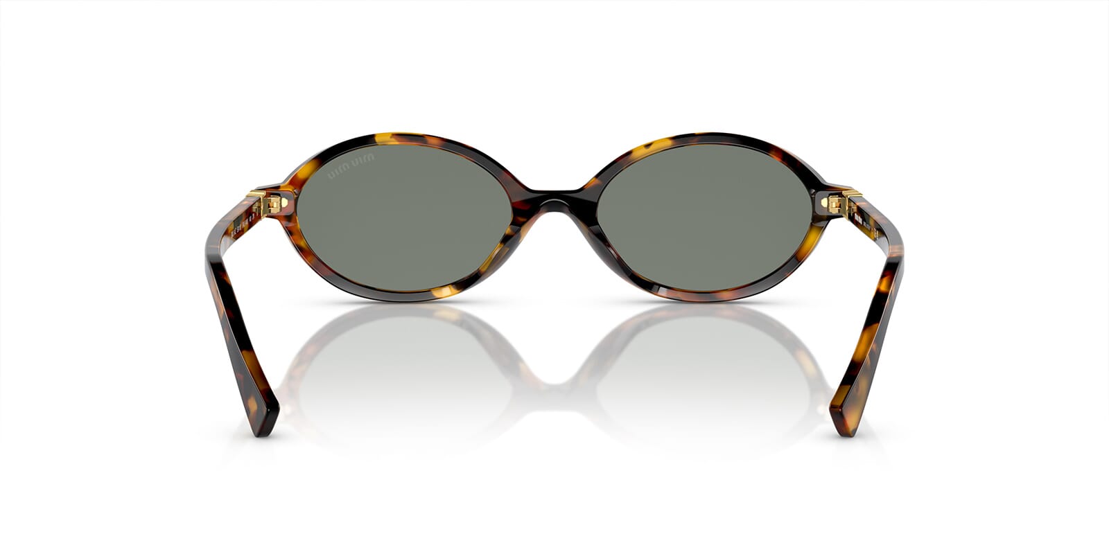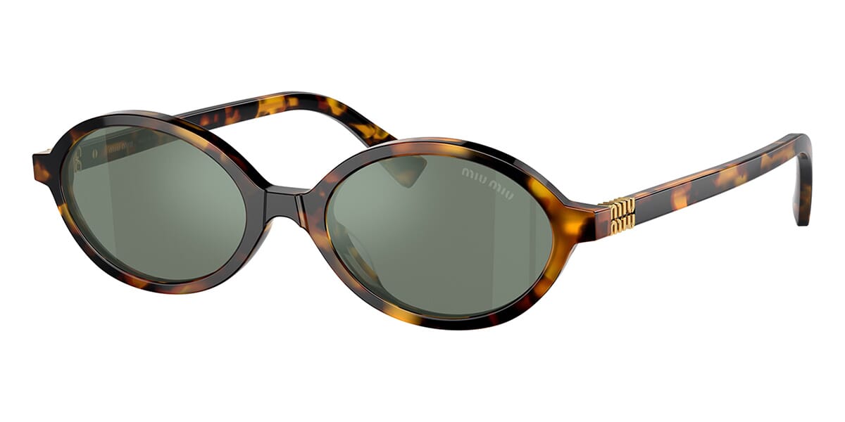 This round Miu Miu sunglass comes in a honey havana frame with green with silver internal mirror lenses.