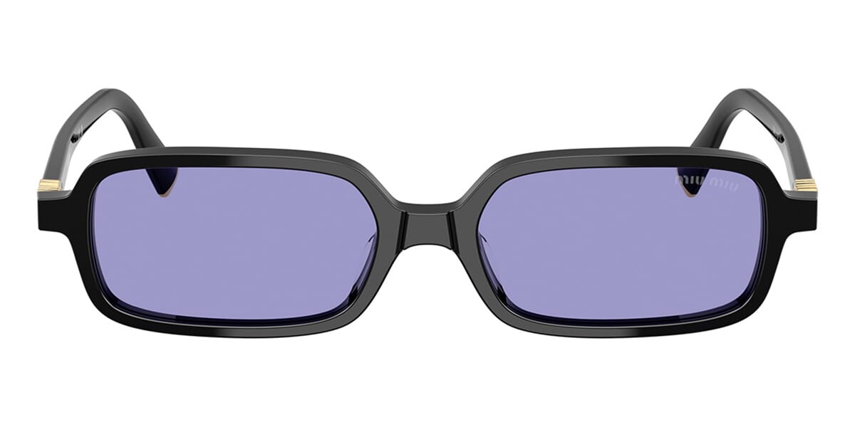 This rectangular Miu Miu sunglass comes in a black frame with violet lenses.