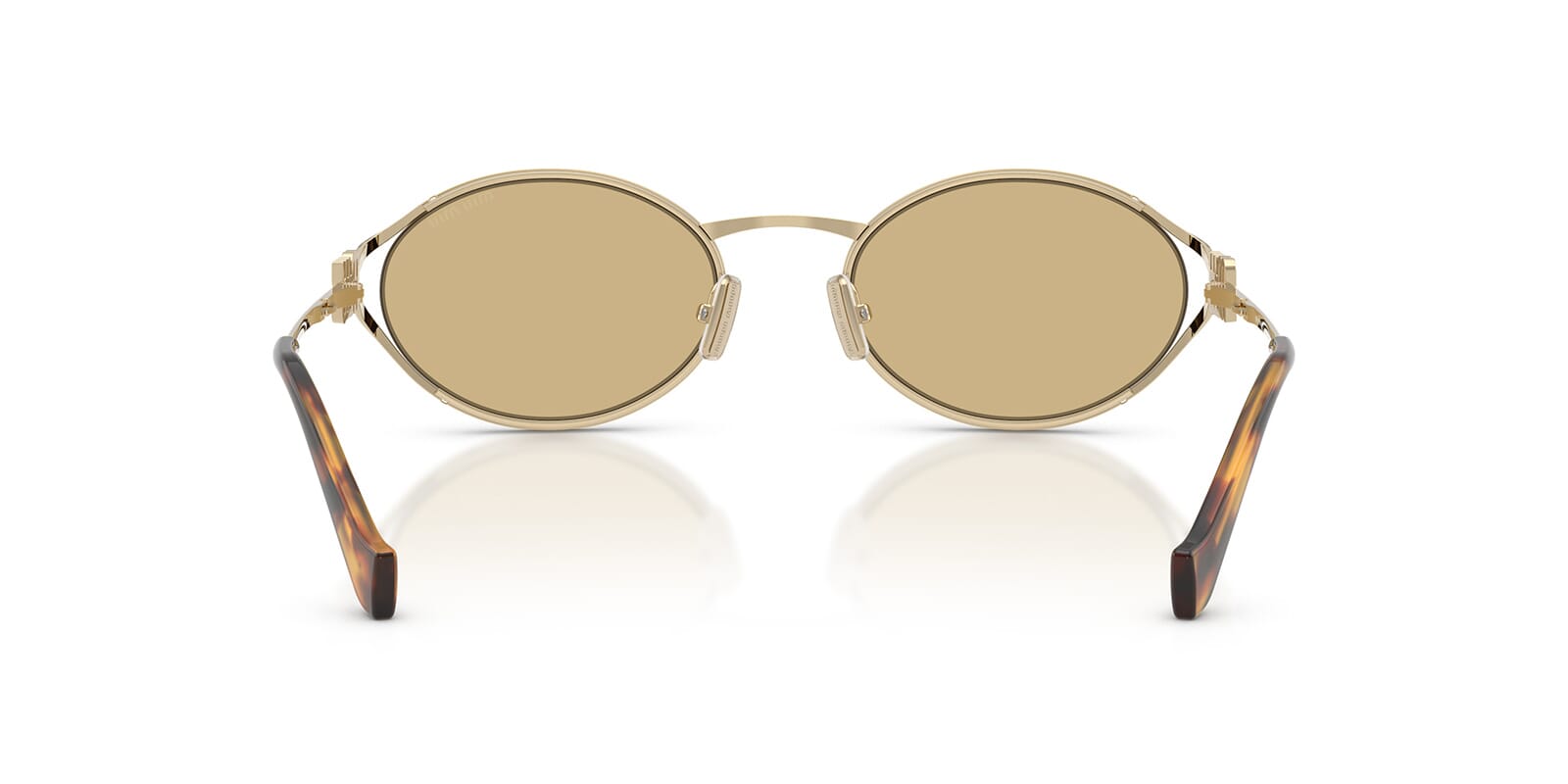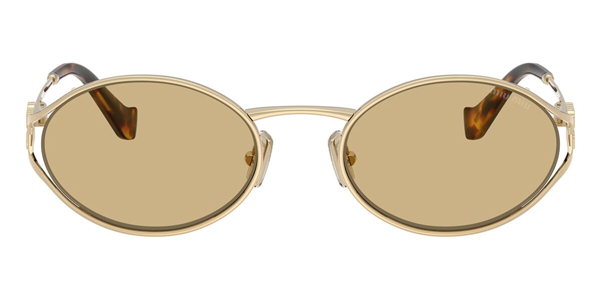 This round Miu Miu sunglass comes in a pale gold frame with yellow lenses.