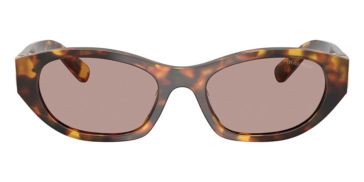 This rectangular Miu Miu sunglass comes in a honey havana frame with light purple brown lenses.