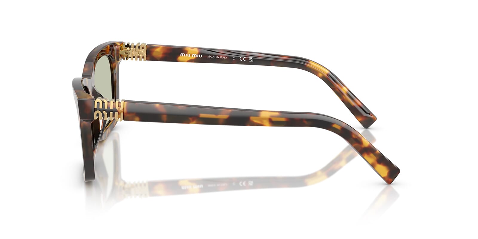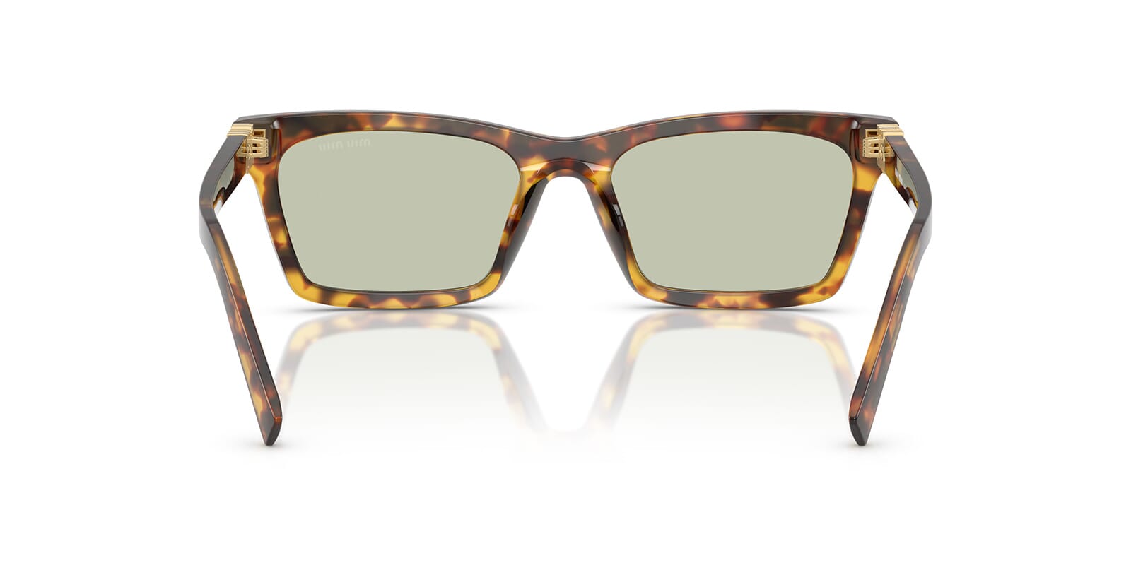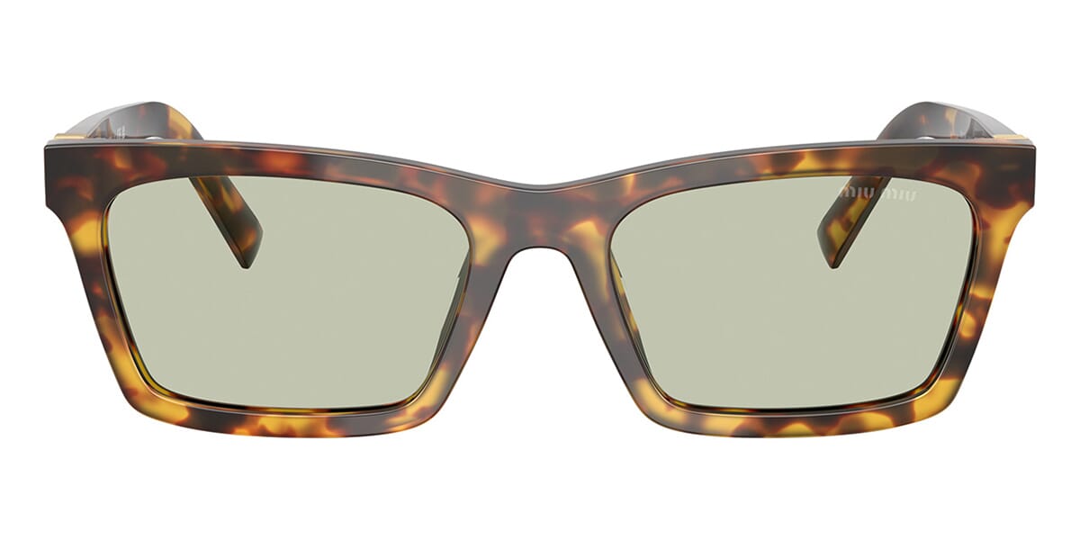 This rectangular Miu Miu sunglass comes in a honey havana frame with light green lenses.