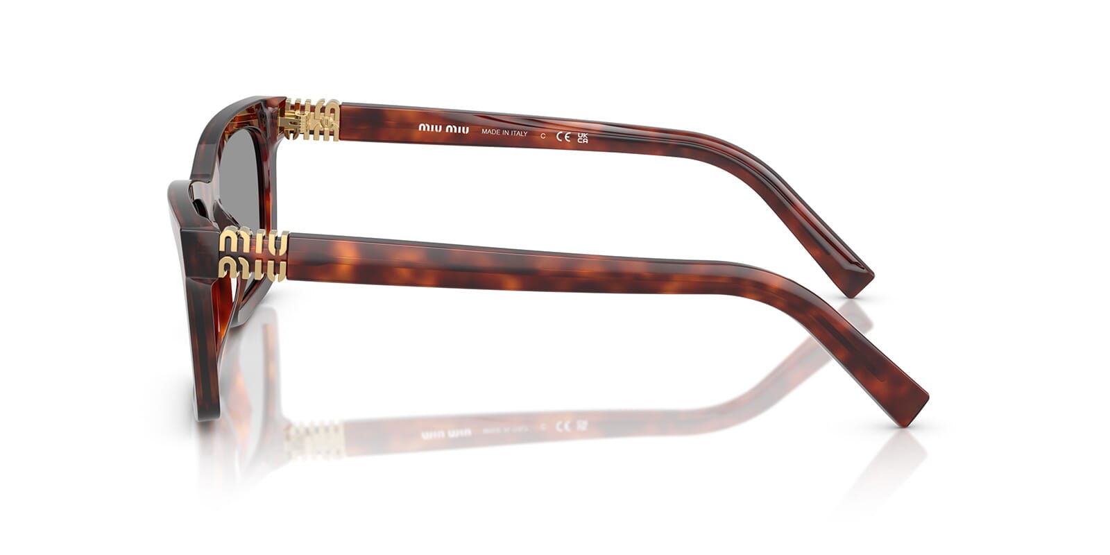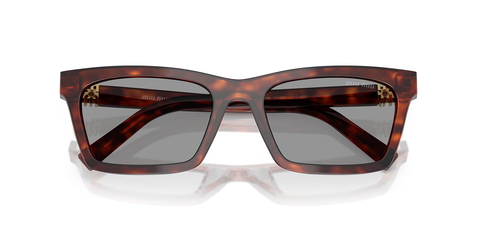 This rectangular Miu Miu sunglass comes in a havana mahogany frame with grey lenses.