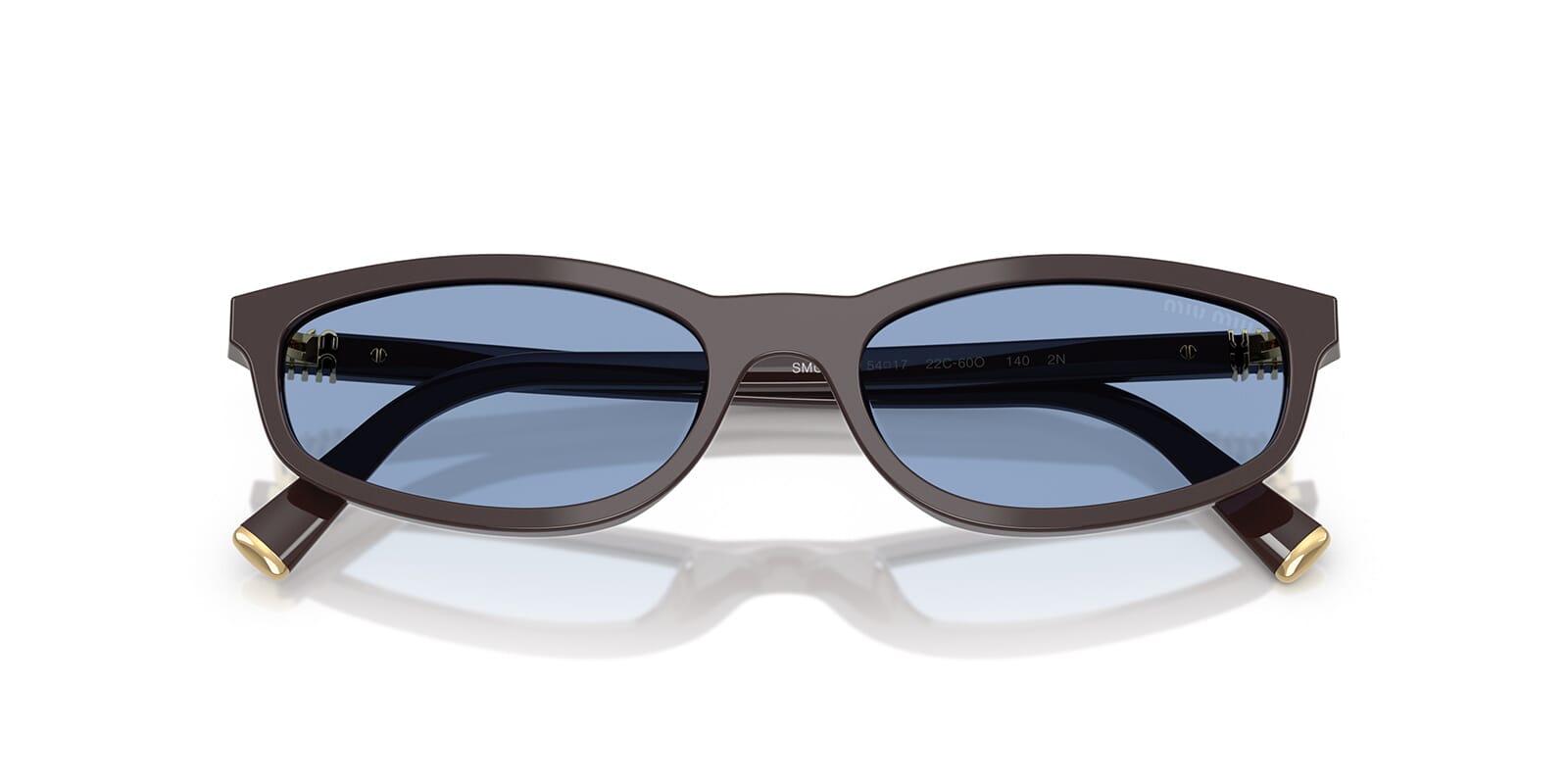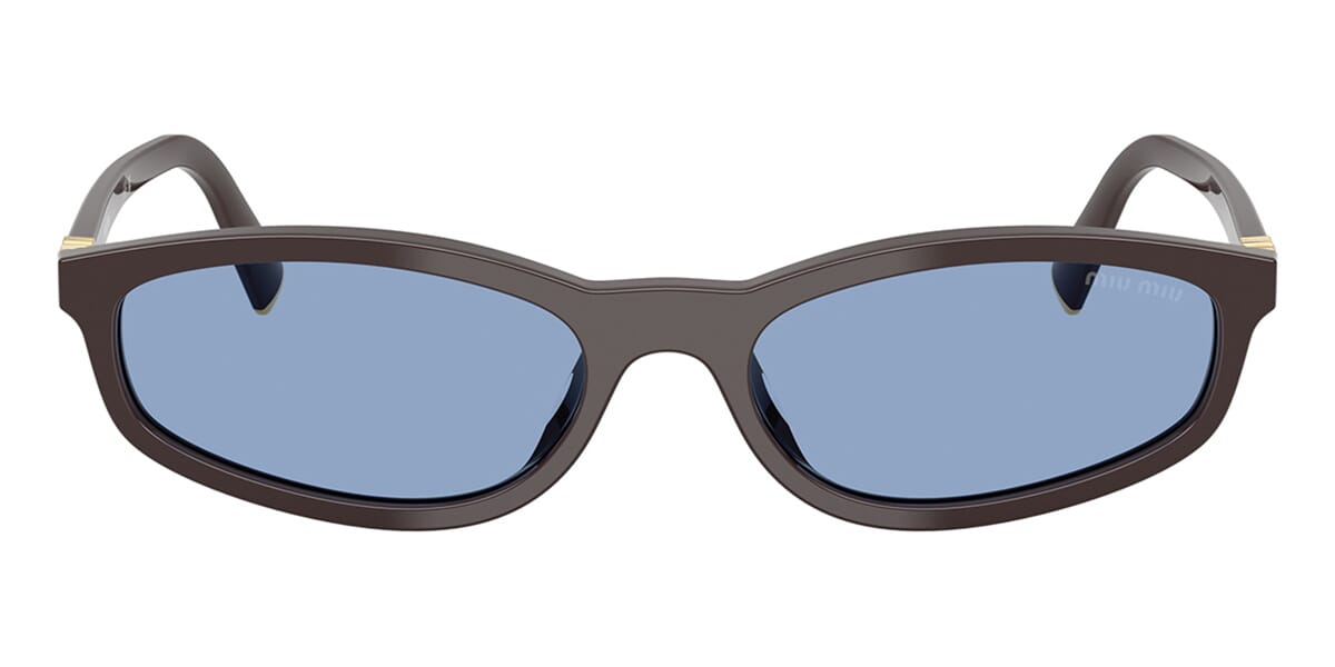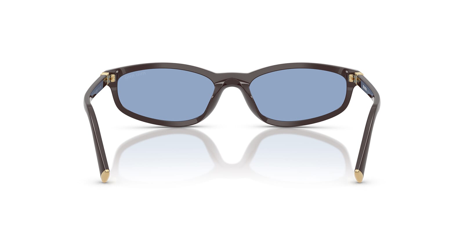 This rectangular Miu Miu sunglass comes in a moka frame with light blue lenses.