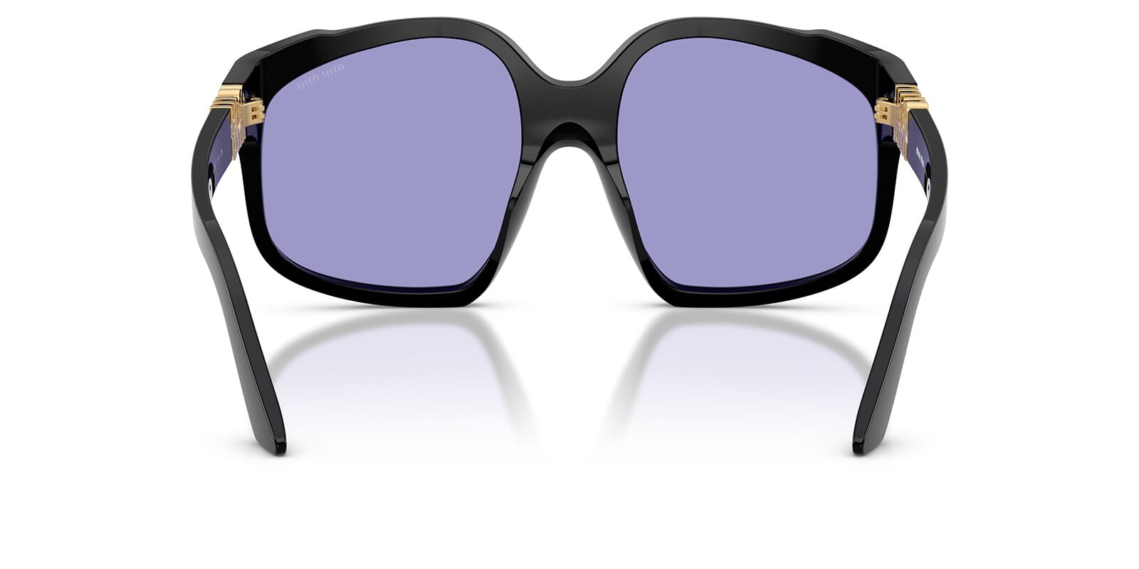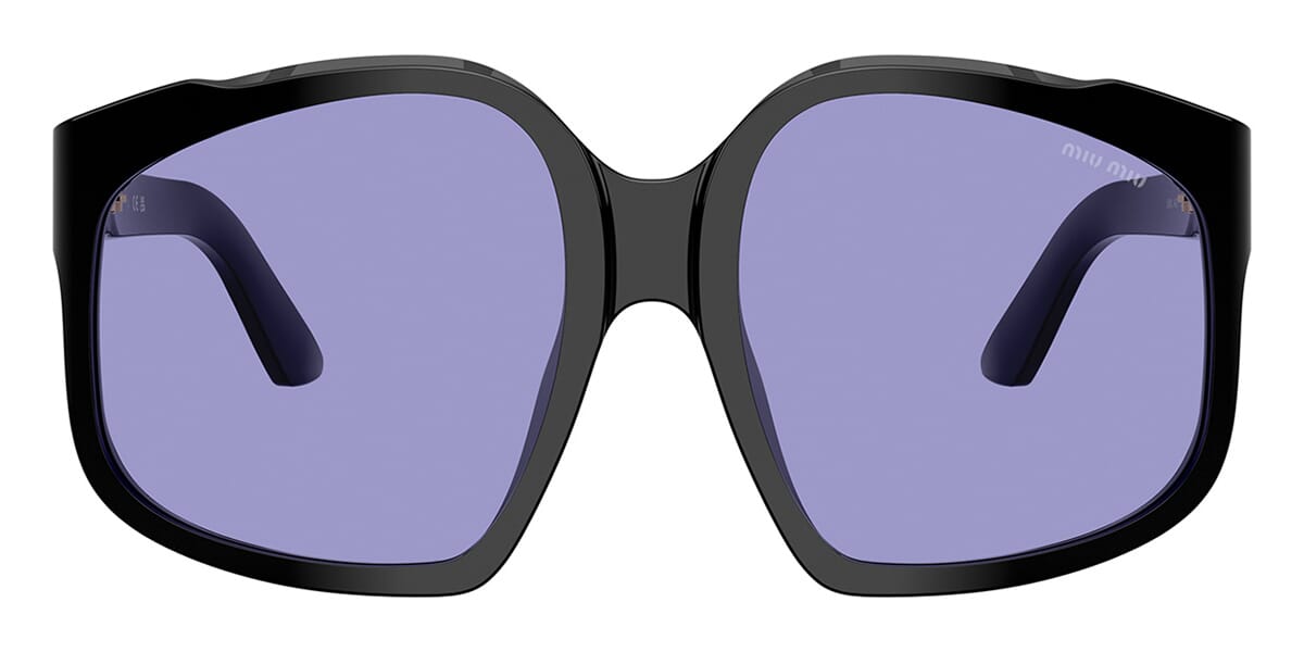 This square Miu Miu sunglass comes in a black frame with violet lenses.