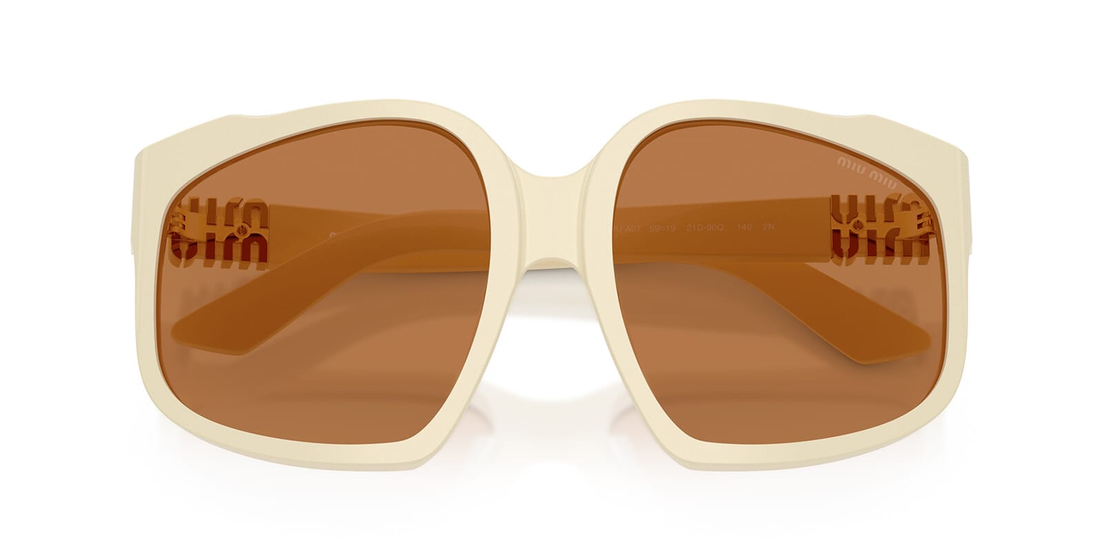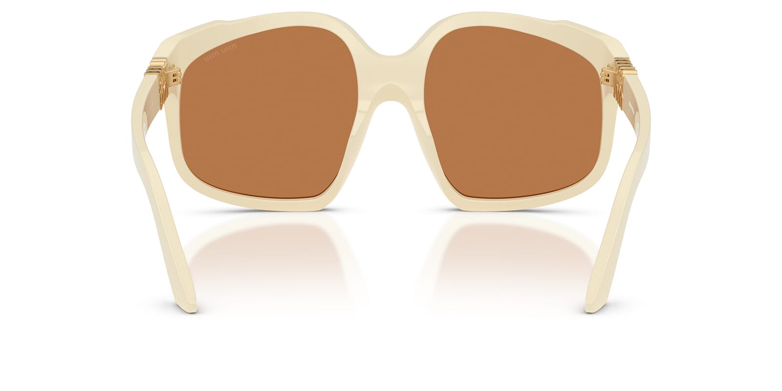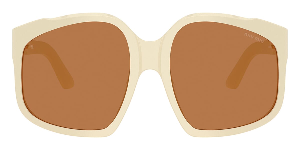 This square Miu Miu sunglass comes in a white milk frame with brown lenses.