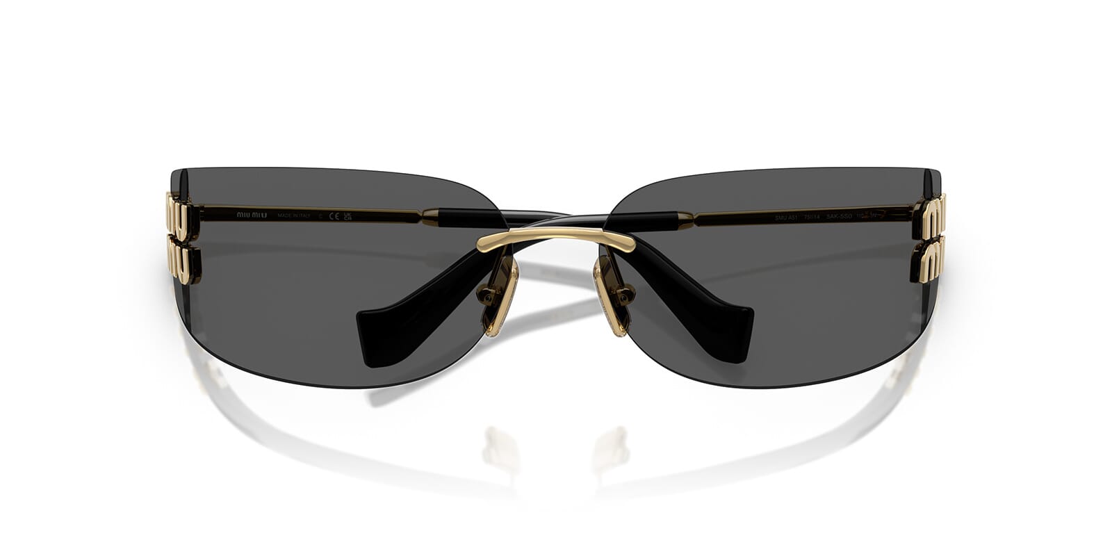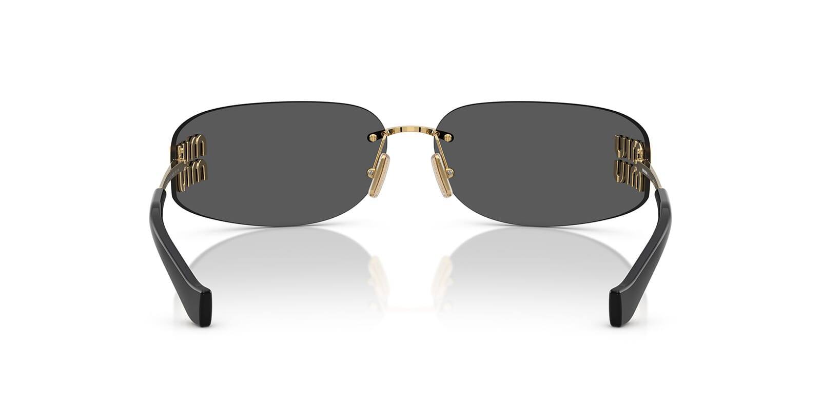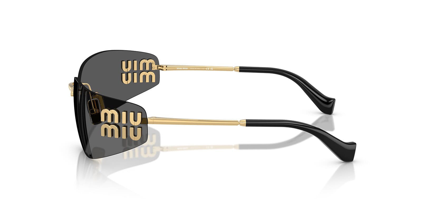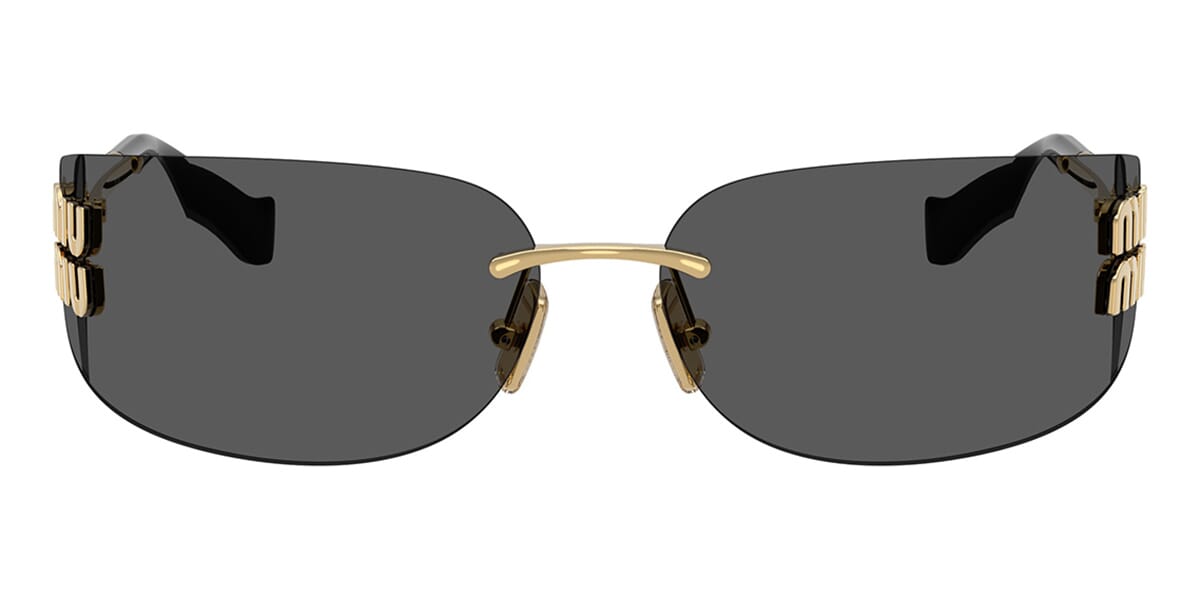 This rectangular Miu Miu sunglass comes in a gold frame with dark grey lenses.