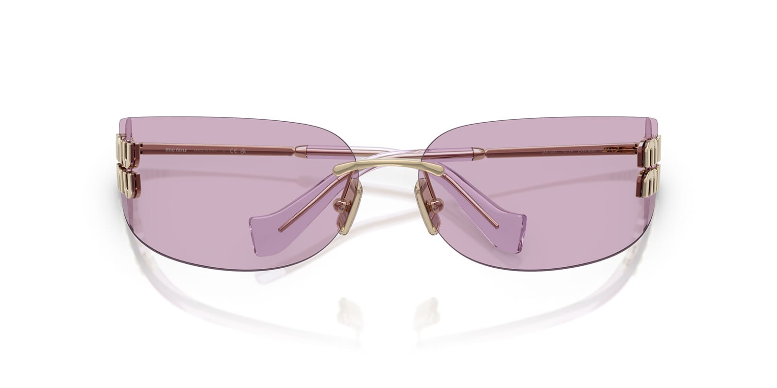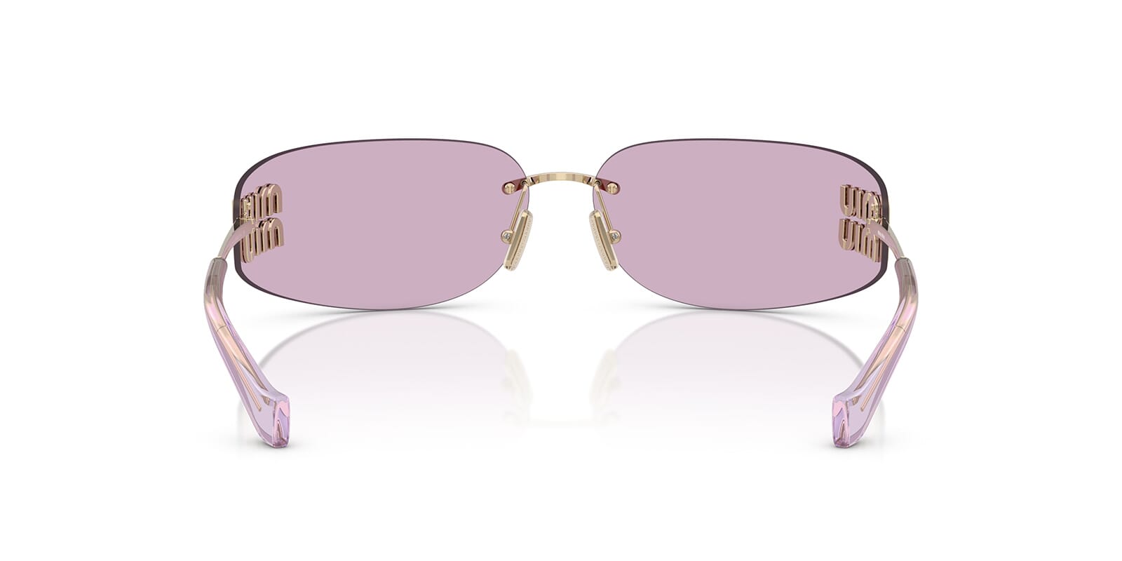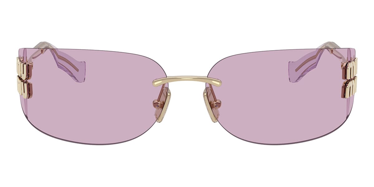 This rectangular Miu Miu sunglass comes in a pale gold frame with pink lenses.