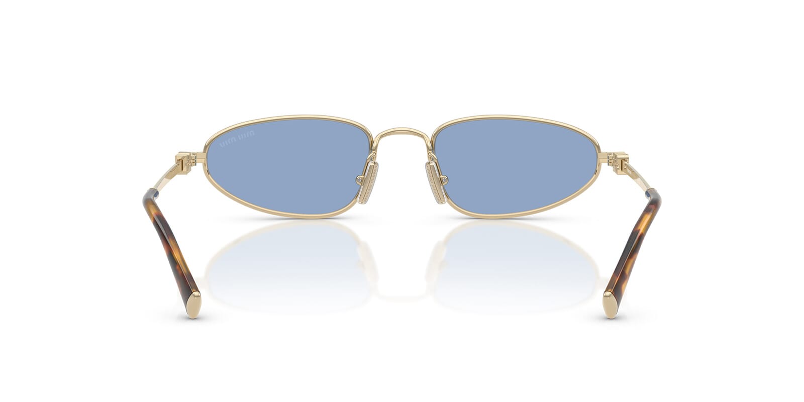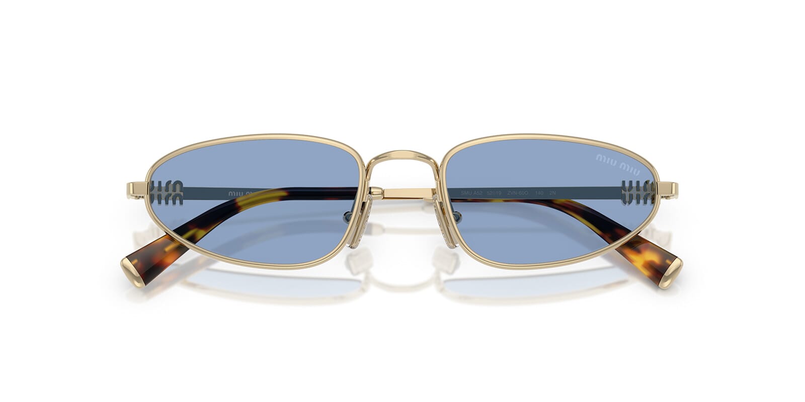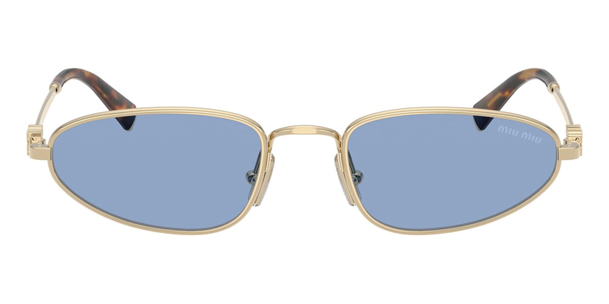 This rectangular Miu Miu sunglass comes in a pale gold frame with light blue lenses.