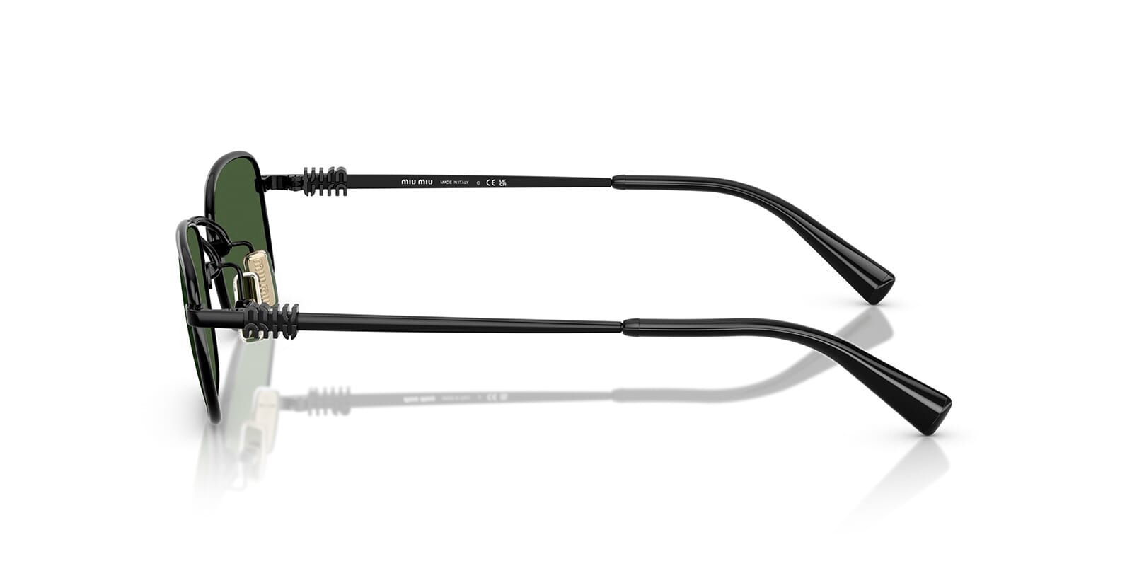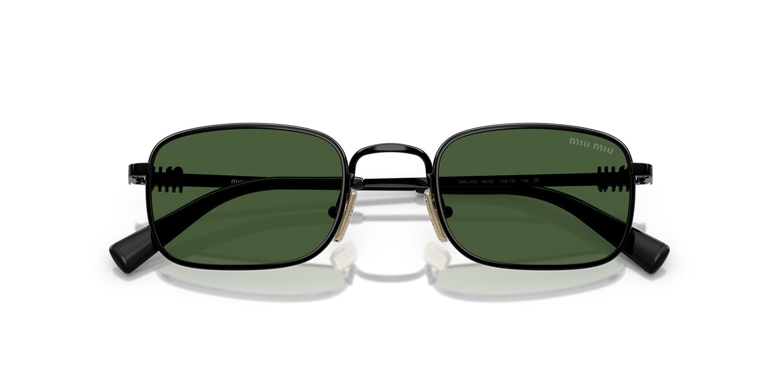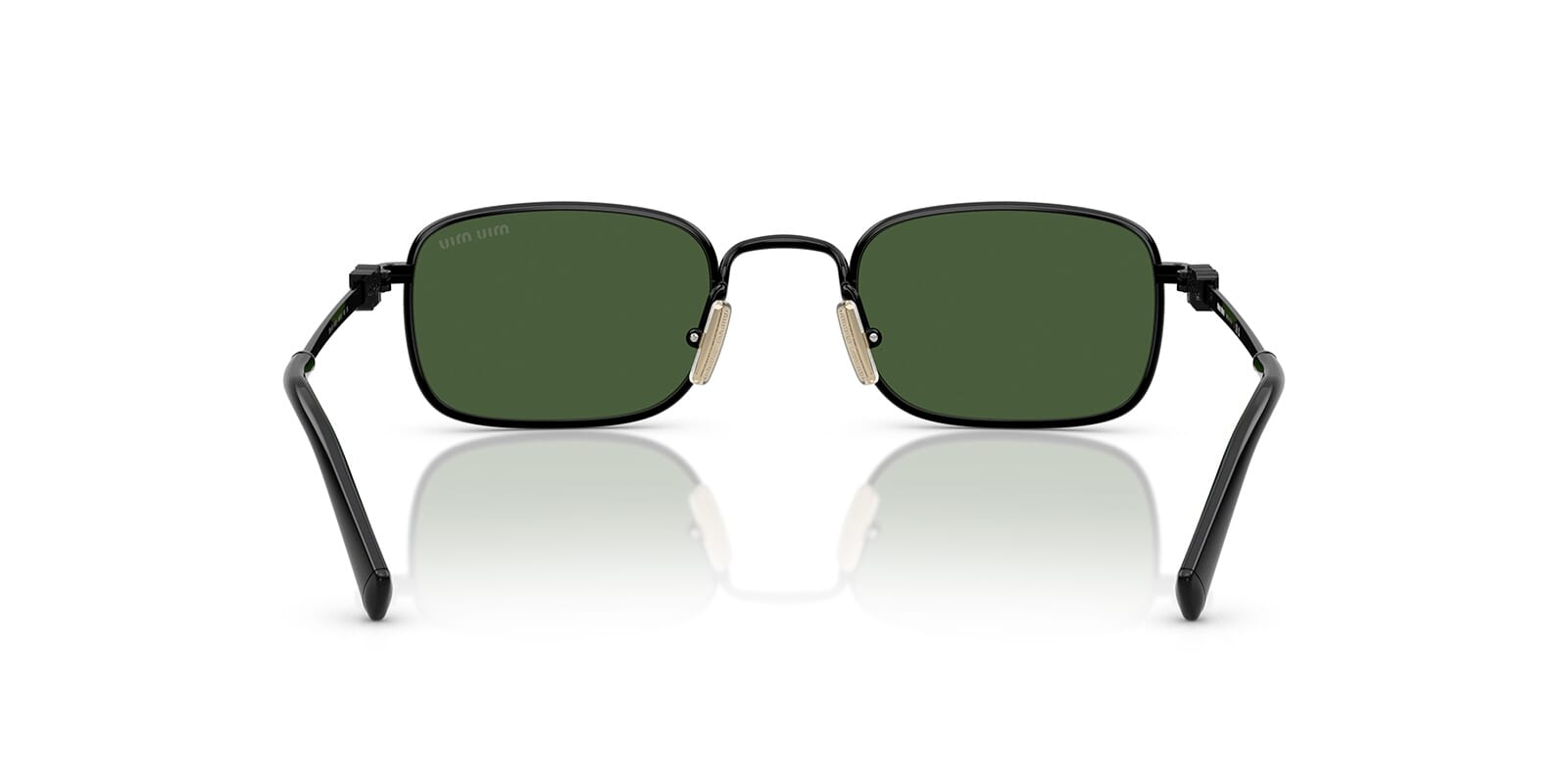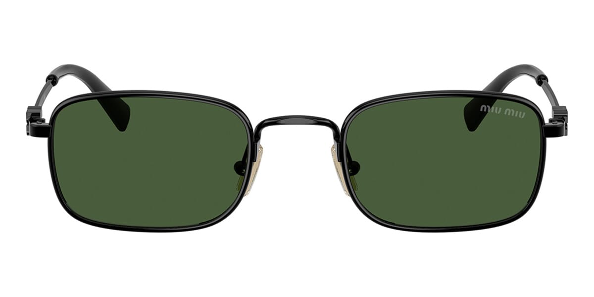 This rectangular Miu Miu sunglass comes in a black frame with dark green lenses.