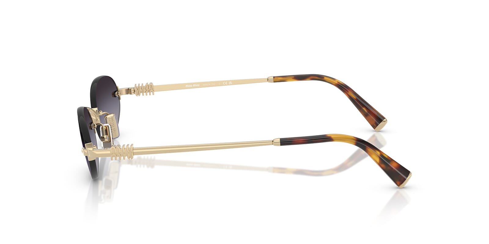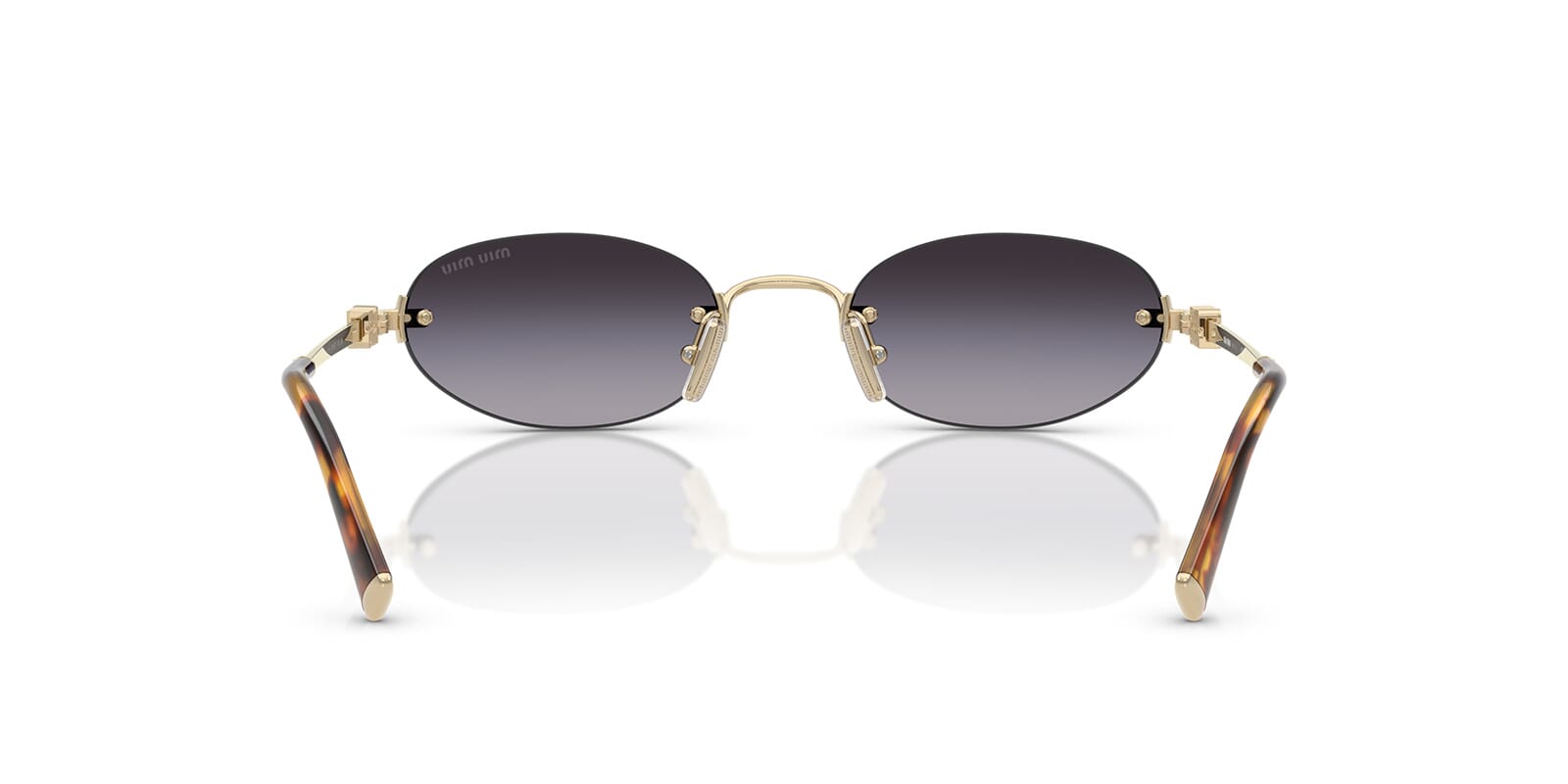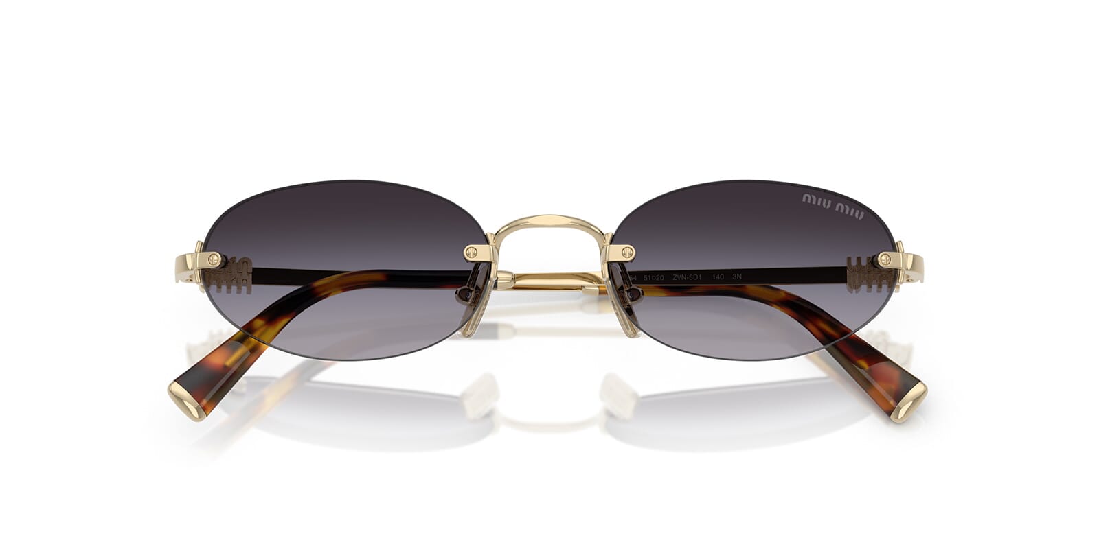 This round Miu Miu sunglass comes in a pale gold frame with grey gradient lenses.