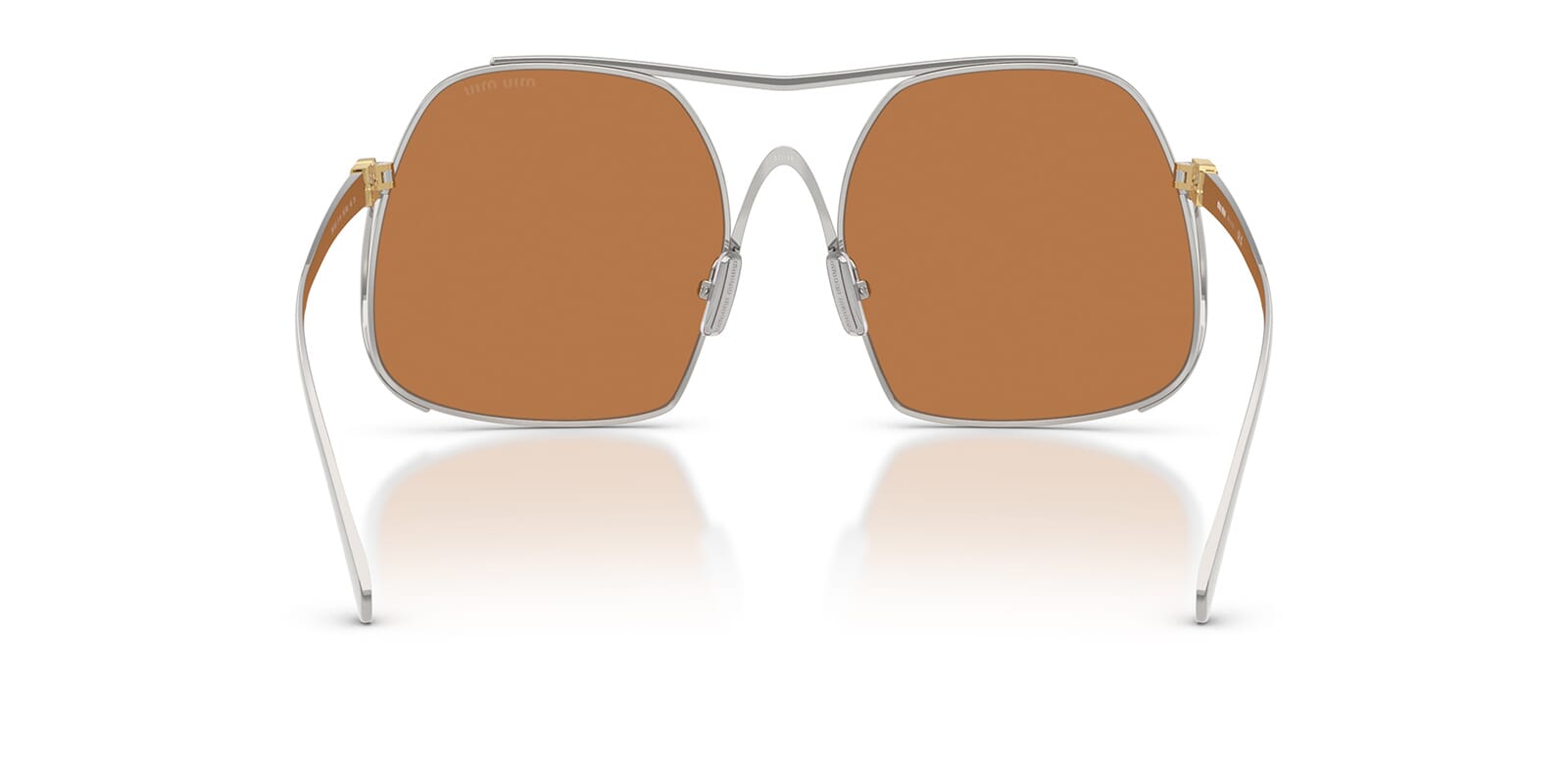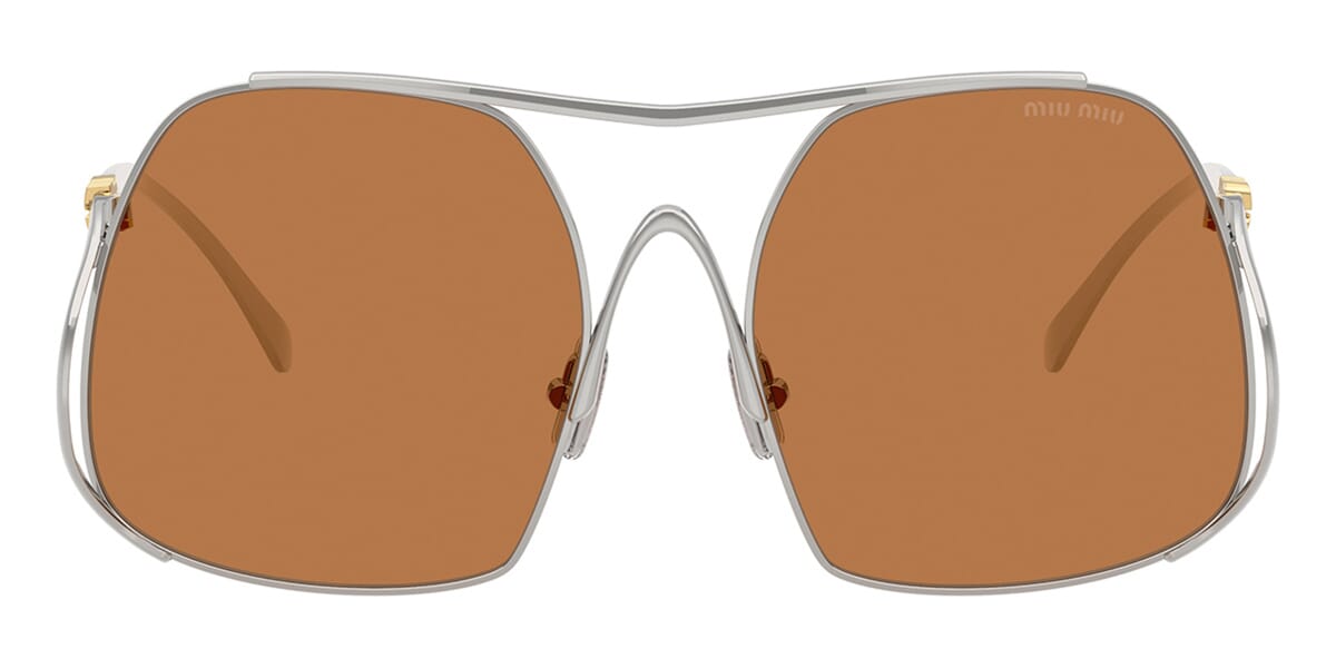 This square Miu Miu sunglass comes in a silver frame with brown lenses.