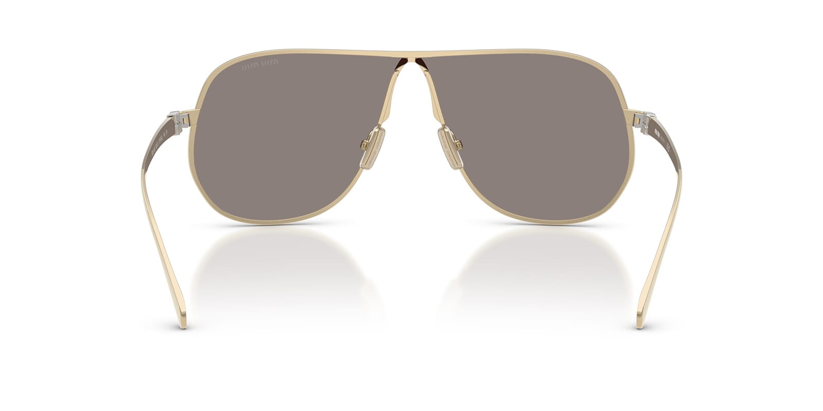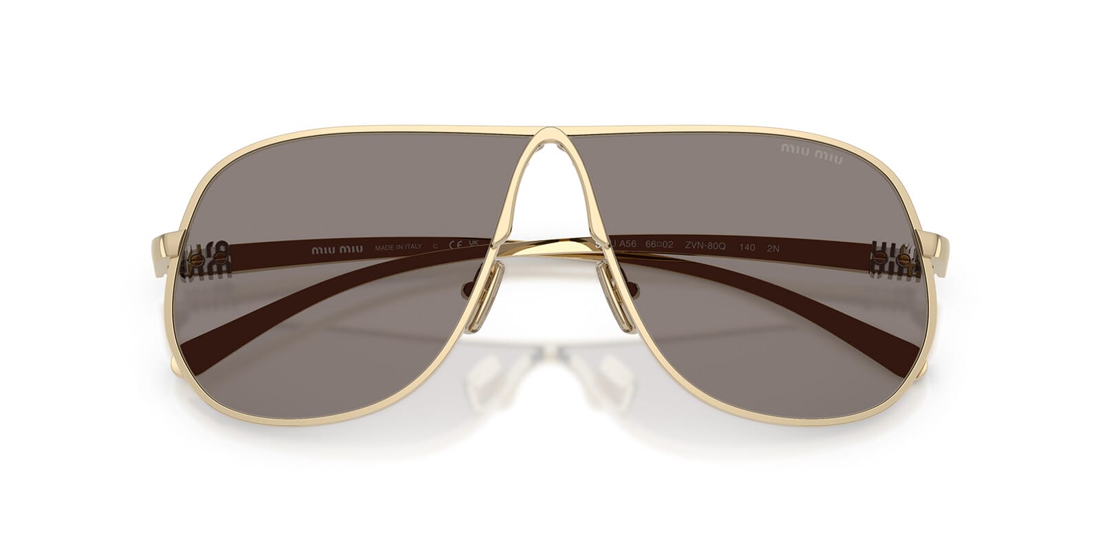 This aviator Miu Miu sunglass comes in a pale gold frame with dark grey lenses.