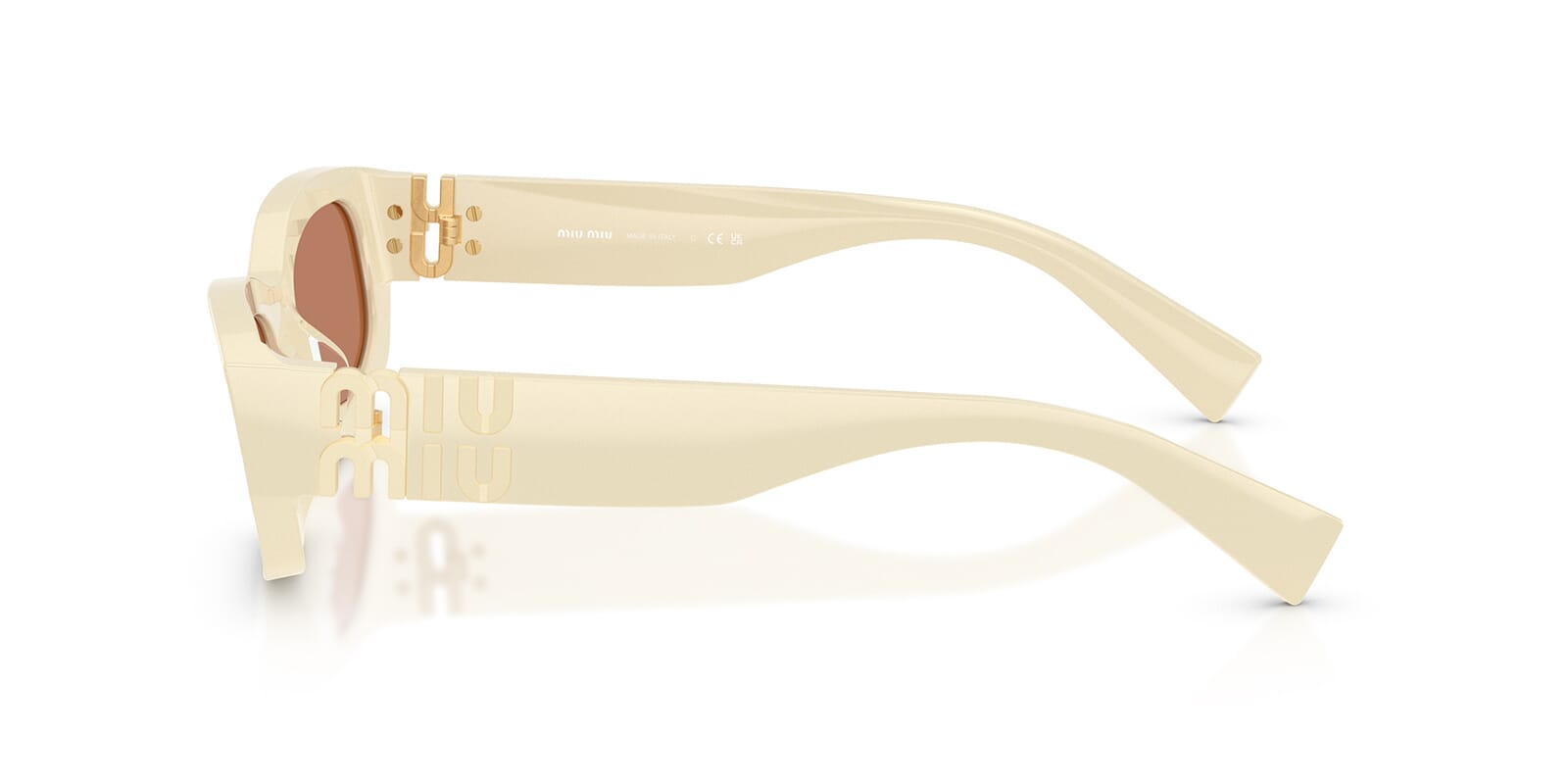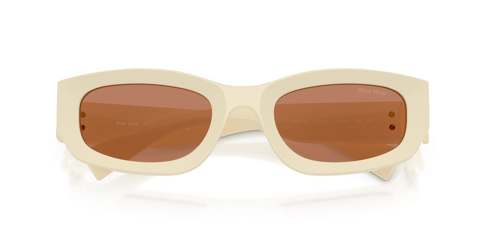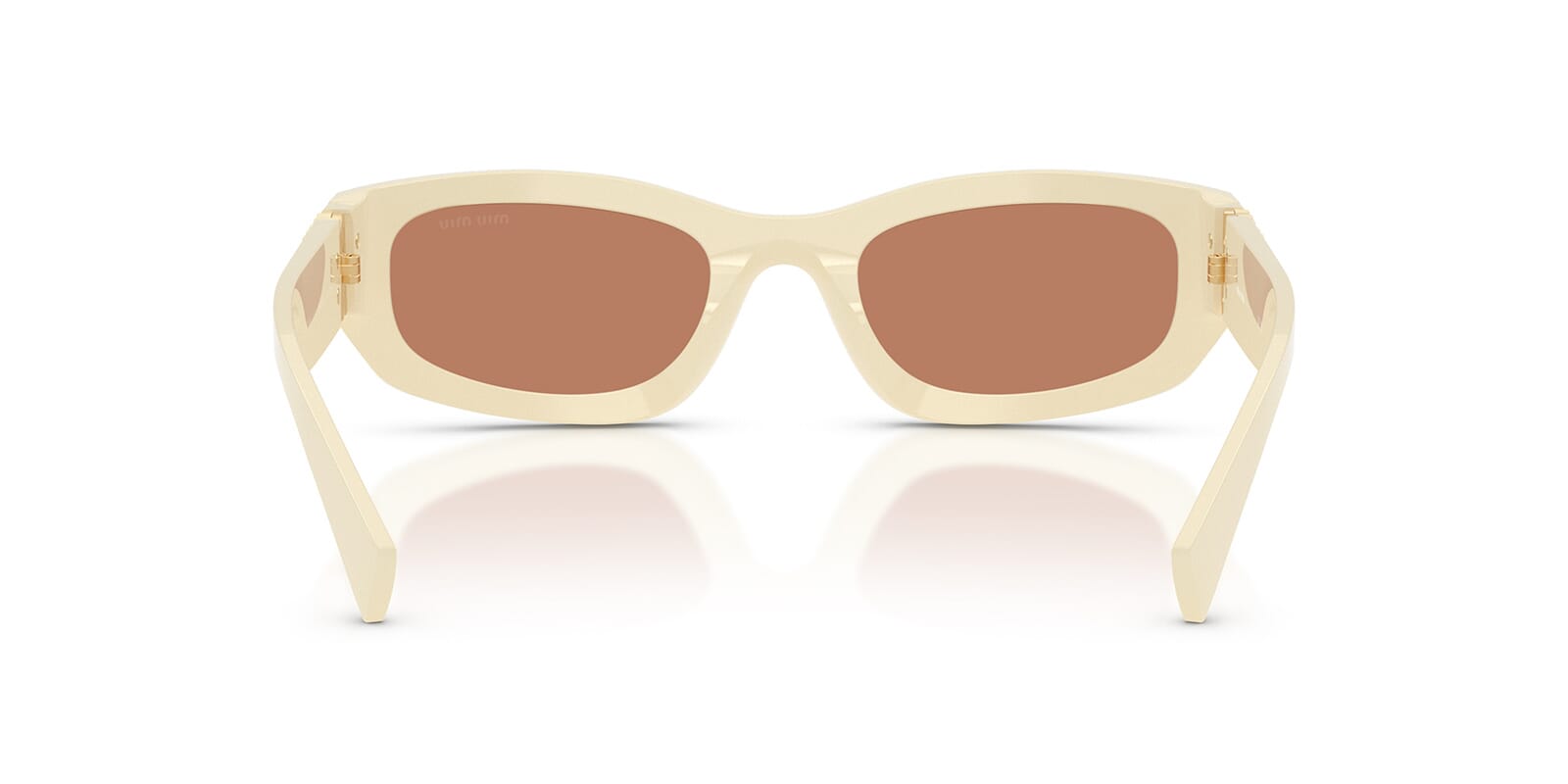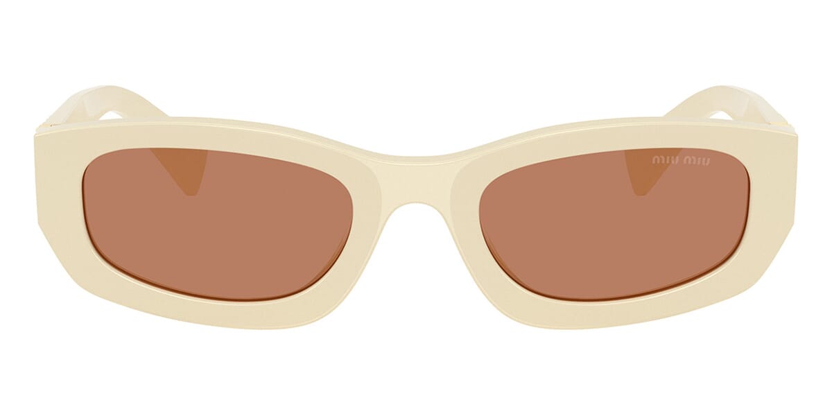 This rectangular Miu Miu sunglass comes in a milk frame with brown lenses.