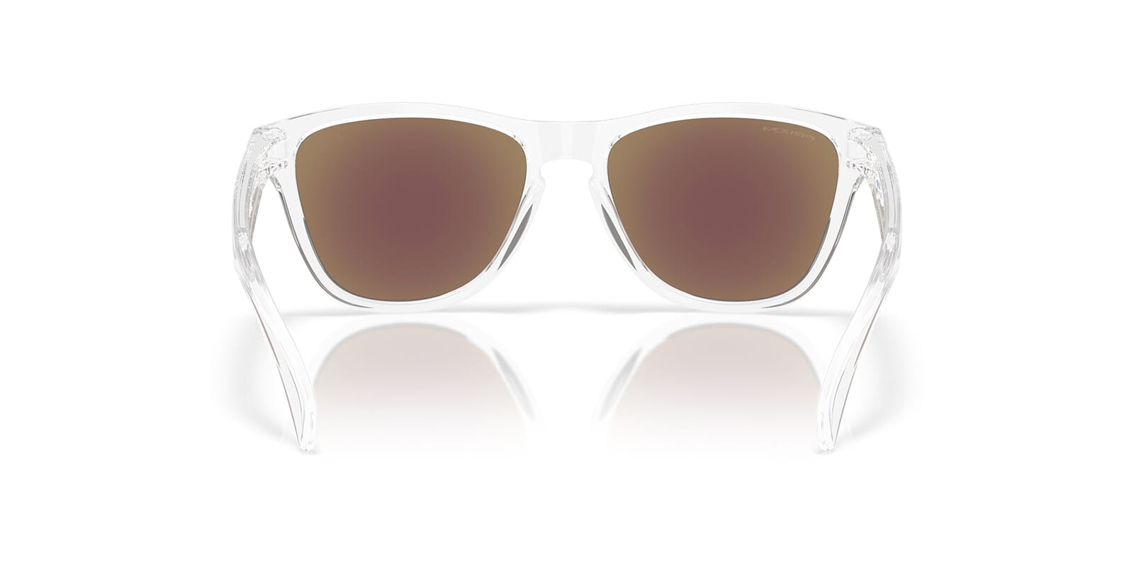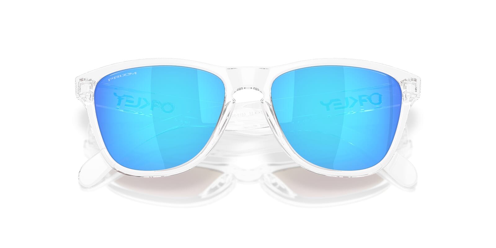 This round Oakley sunglass comes in a polished clear frame with prizm sapphire lenses.