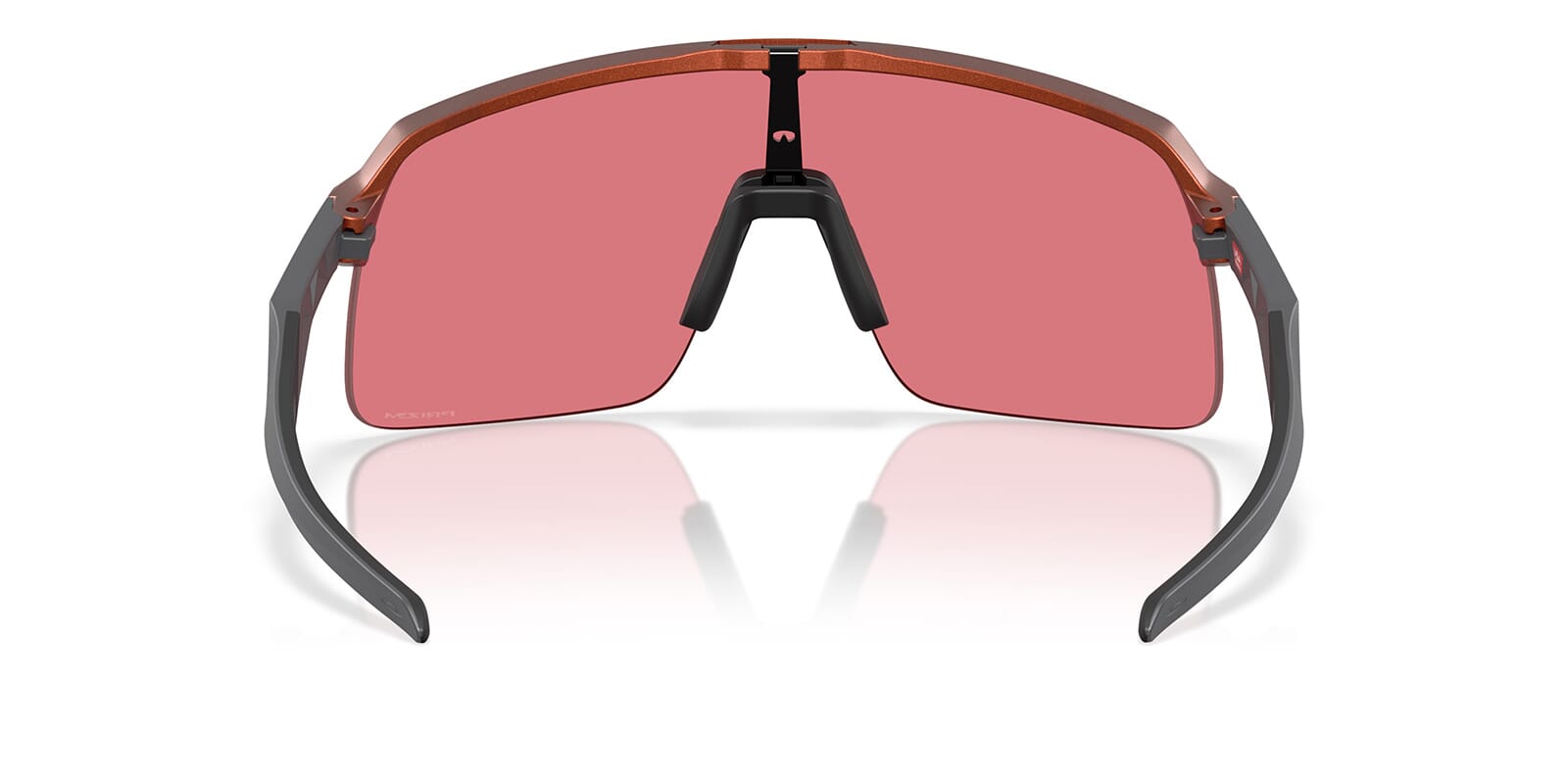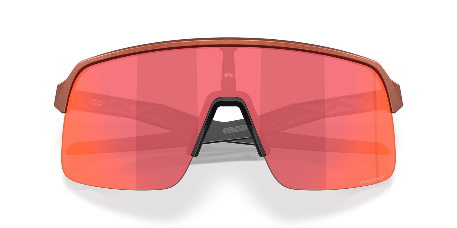 This square Oakley sunglass comes in a fire orange frame with prizm trail torch lenses.