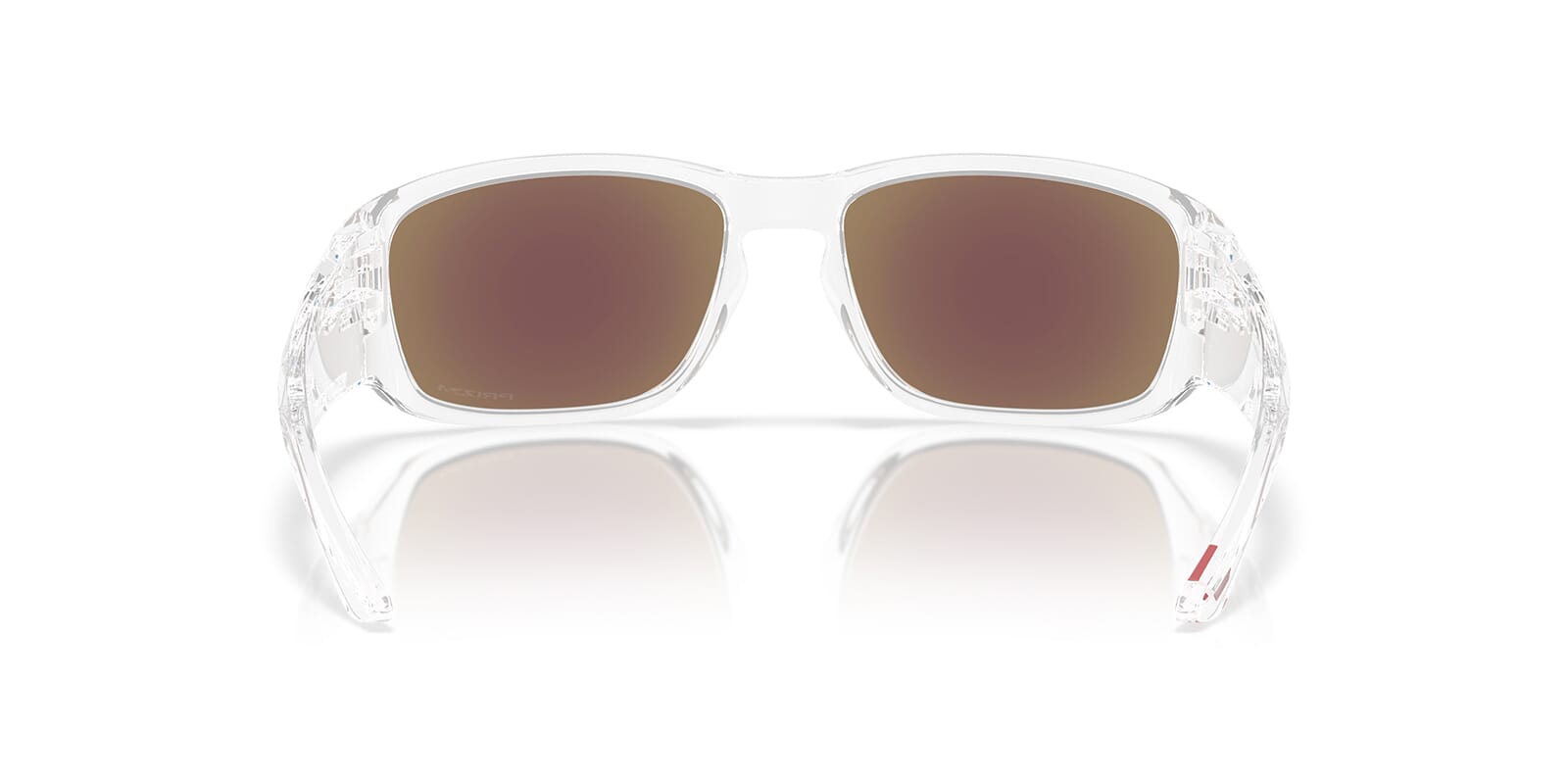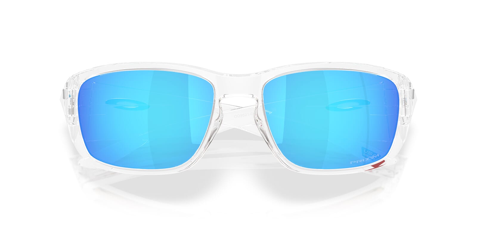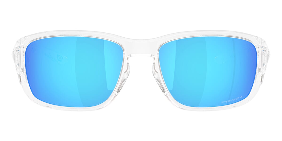 This square Oakley sunglass comes in a polar clear frame with prizm sapphire lenses.