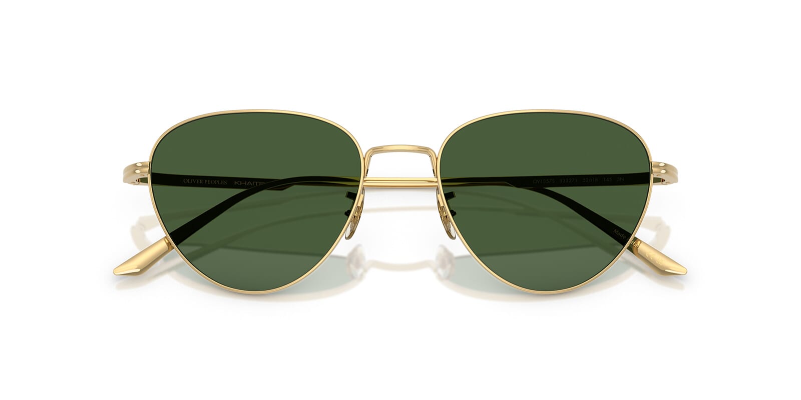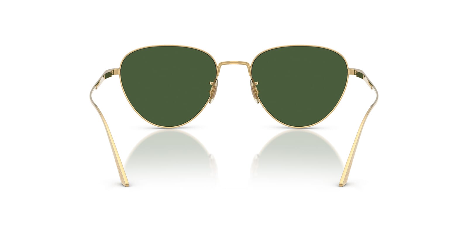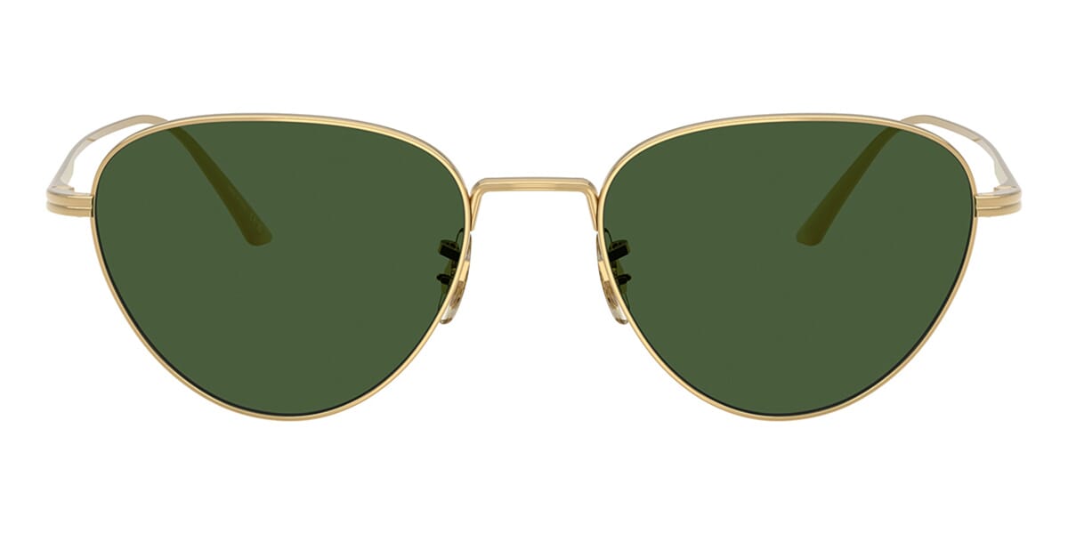 This cat eye Oliver Peoples sunglass comes in a gold frame with vibrant green lenses.