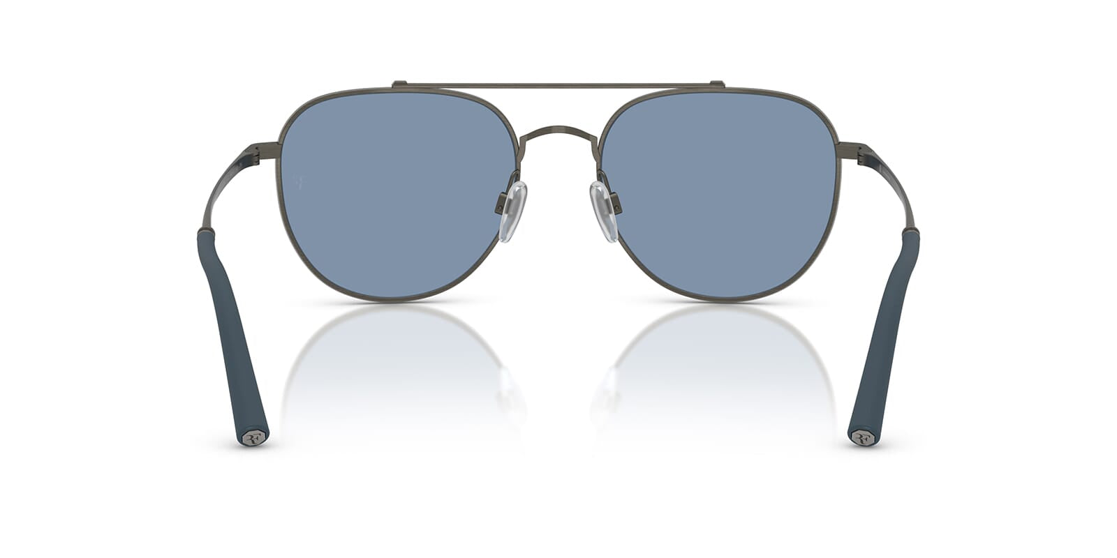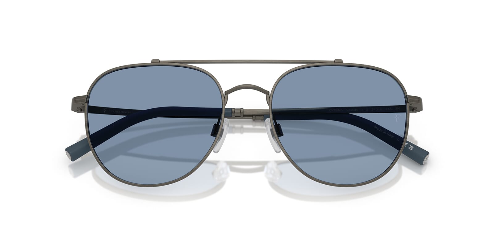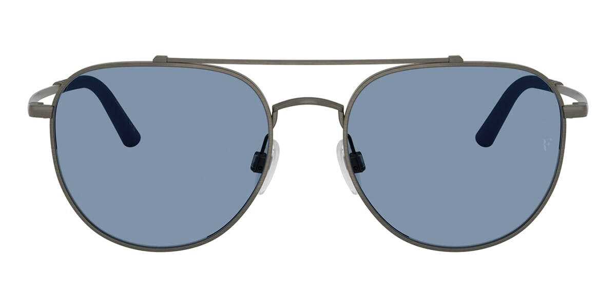 This aviator Oliver Peoples sunglass comes in a pewter frame with marine lenses.