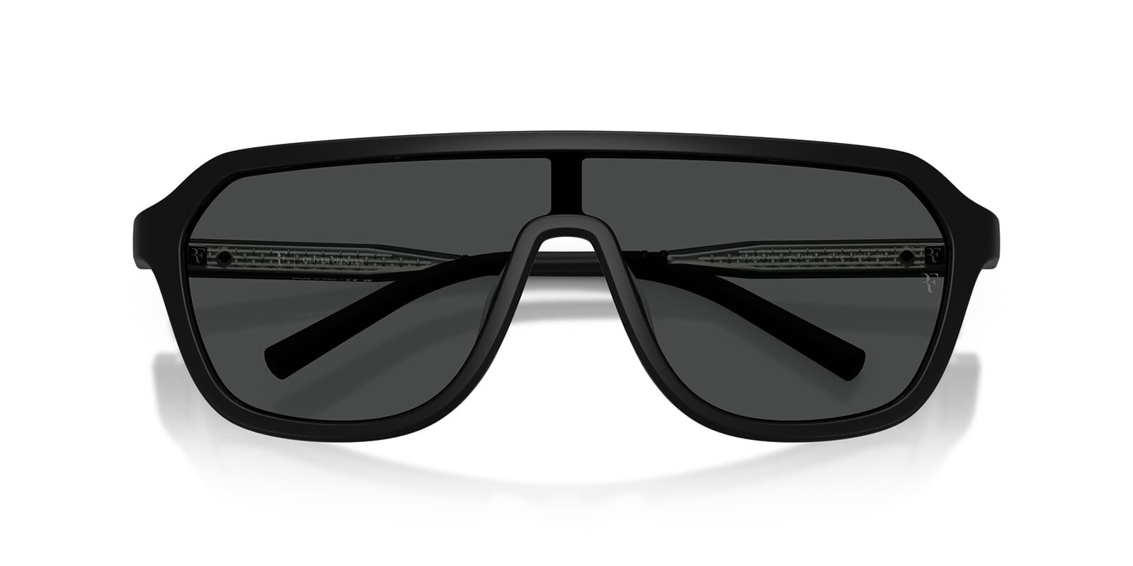 This shield Oliver Peoples sunglass comes in a semi-matte black frame with dark slate lenses.