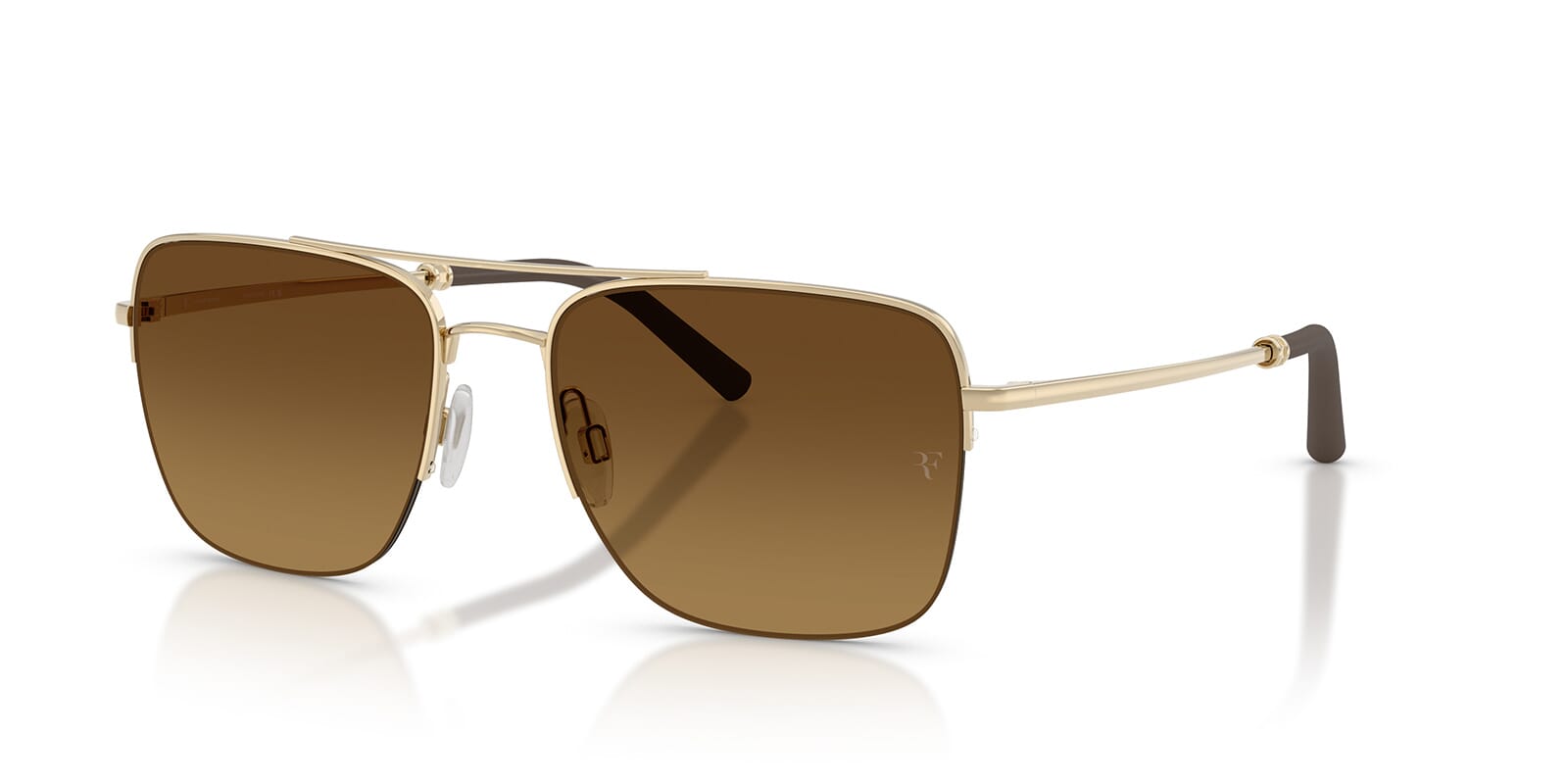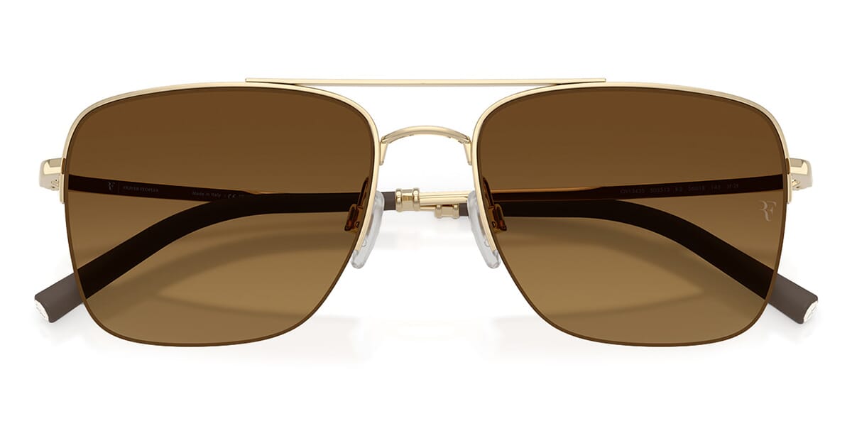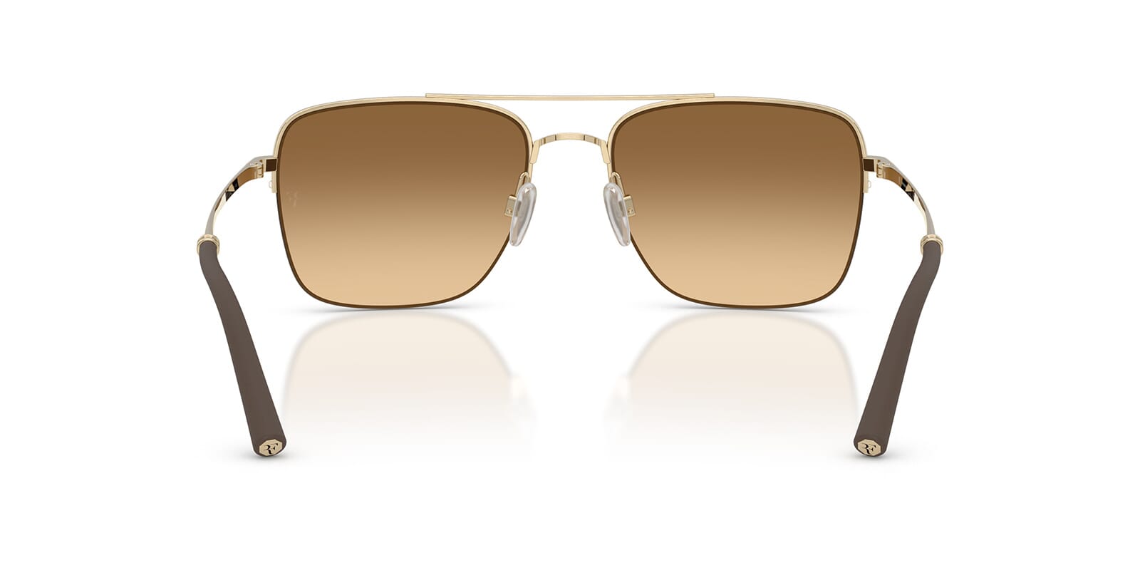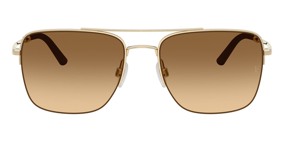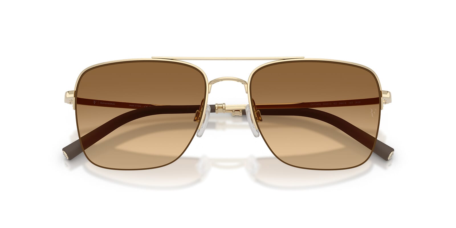 This aviator Oliver Peoples sunglass comes in a gold frame with dark saddle gradient lenses.