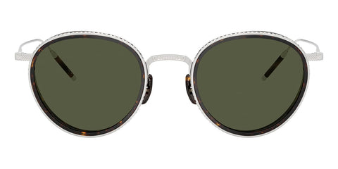 This round Oliver Peoples sunglass comes in a 18k white gold plated frame with g-15 green lenses.