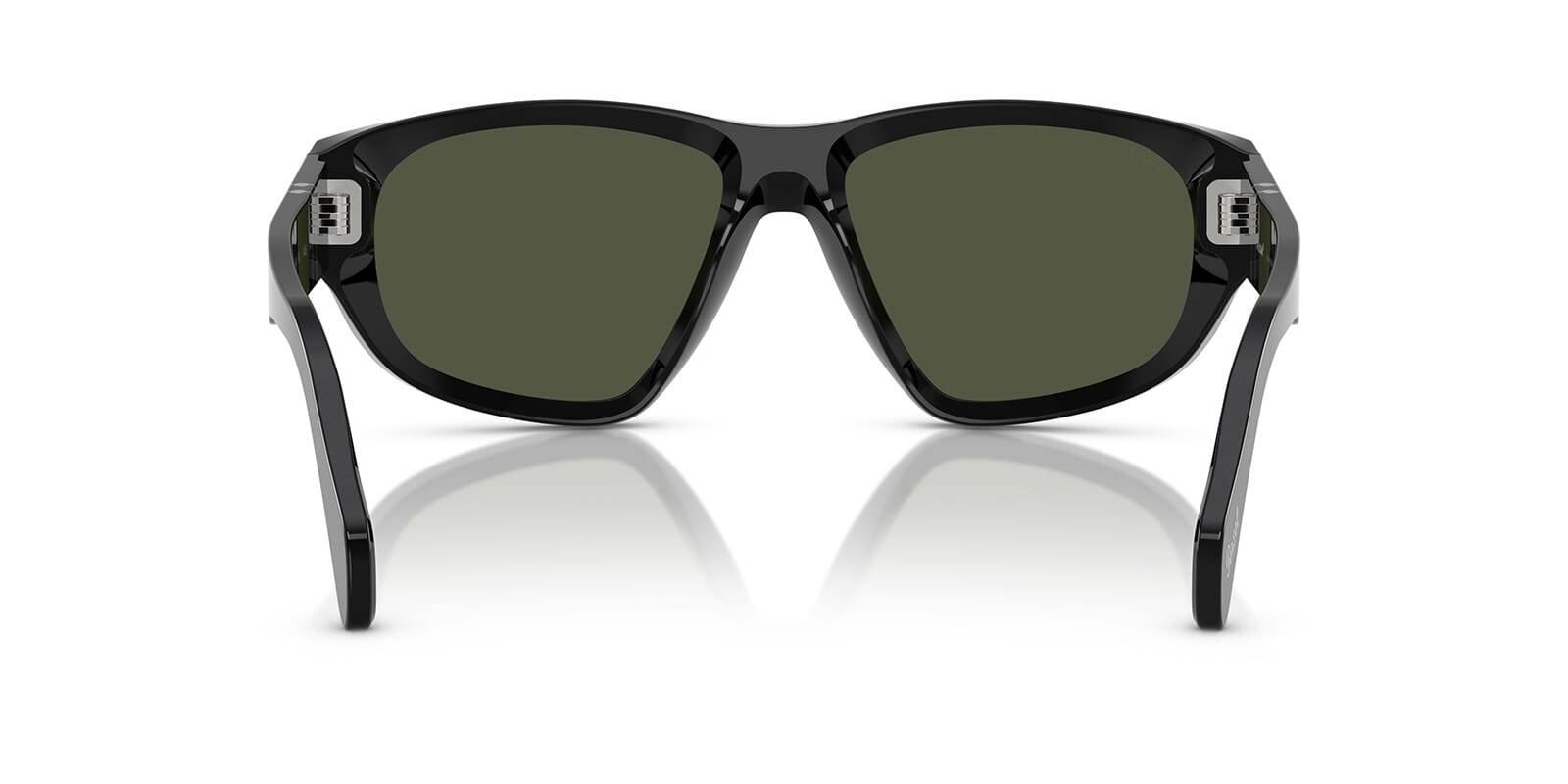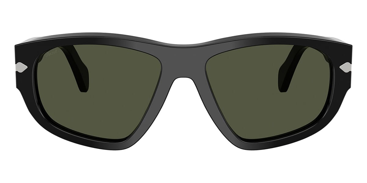 This rectangular Persol sunglass comes in a black frame with green lenses.