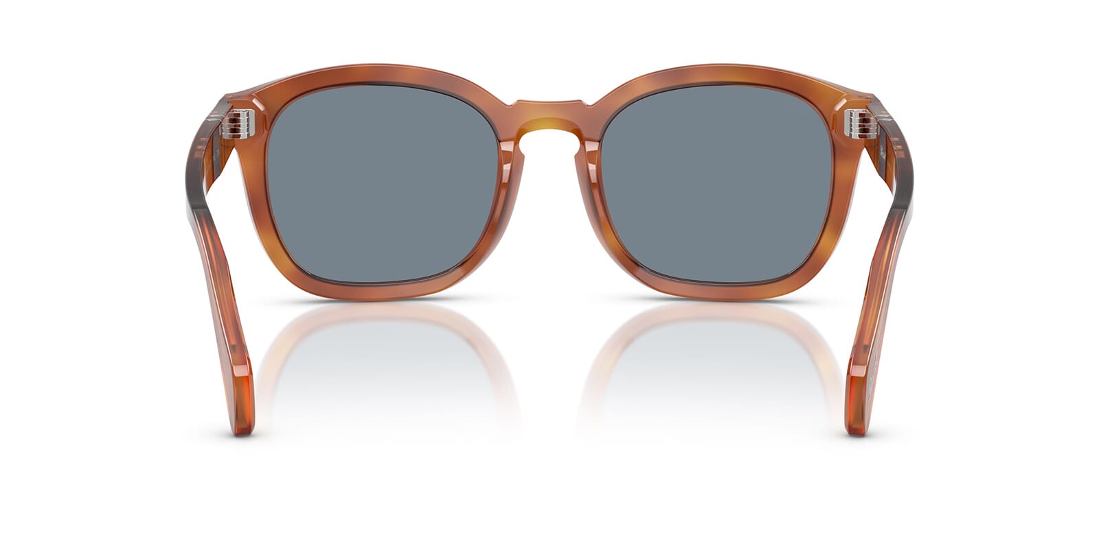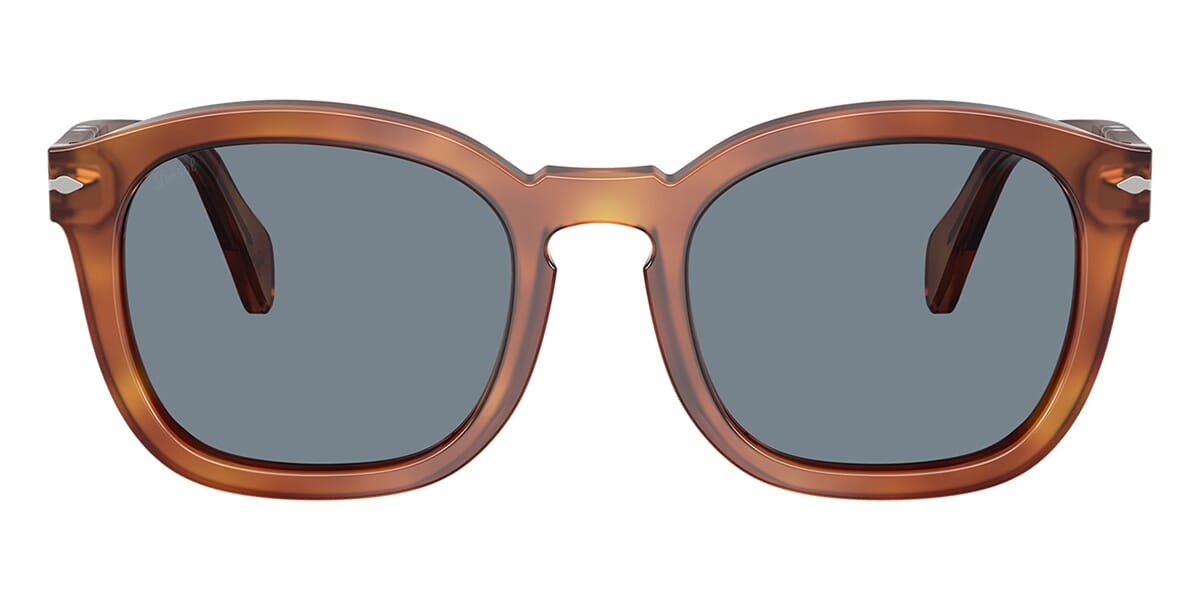 This square Persol sunglass comes in a terra di siena frame with light blue lenses.