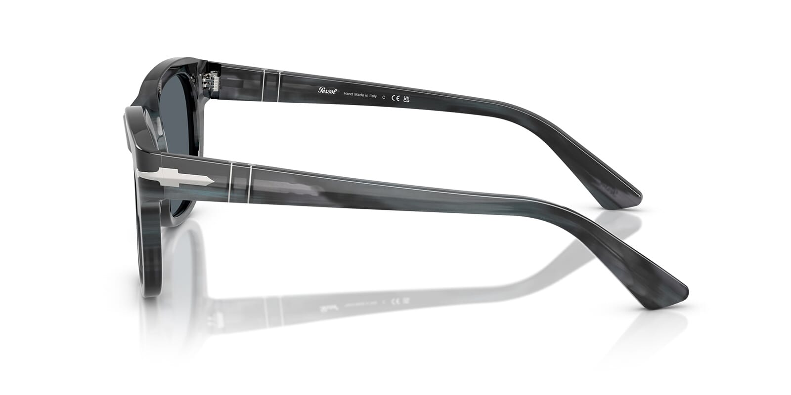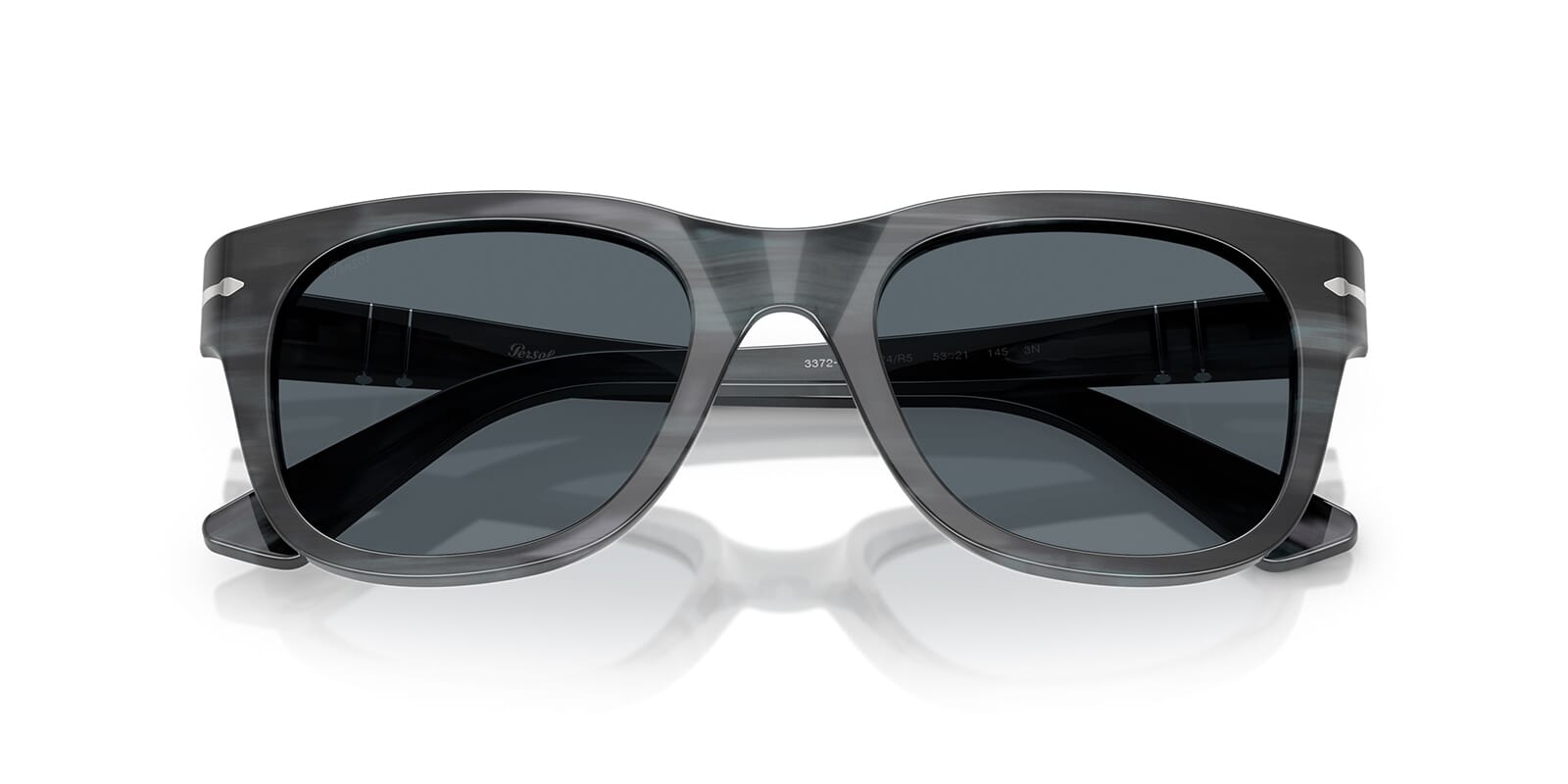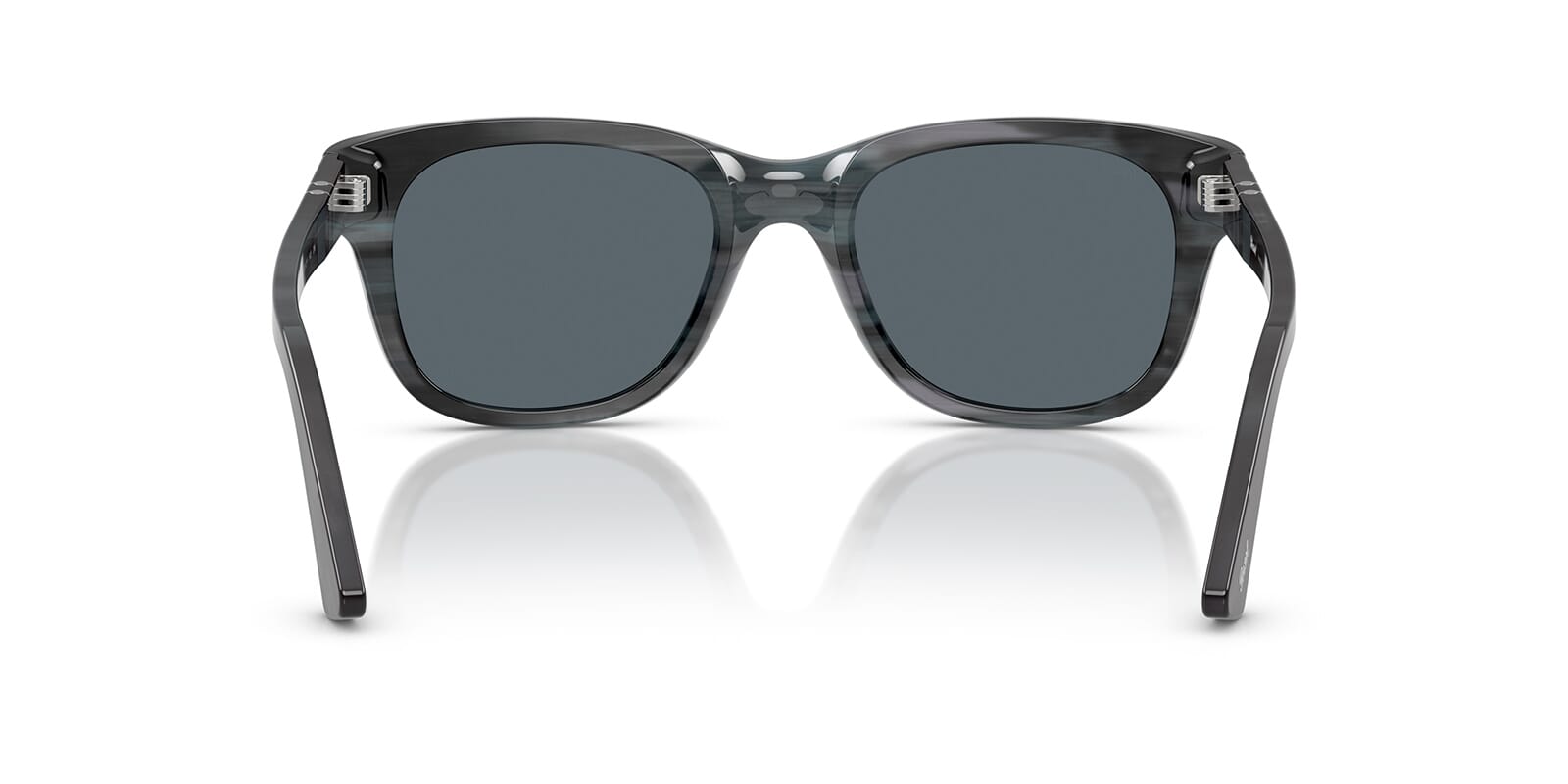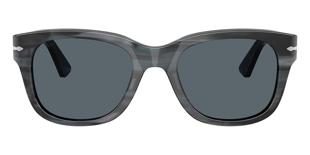 This square Persol sunglass comes in a striped grey frame with blue lenses.