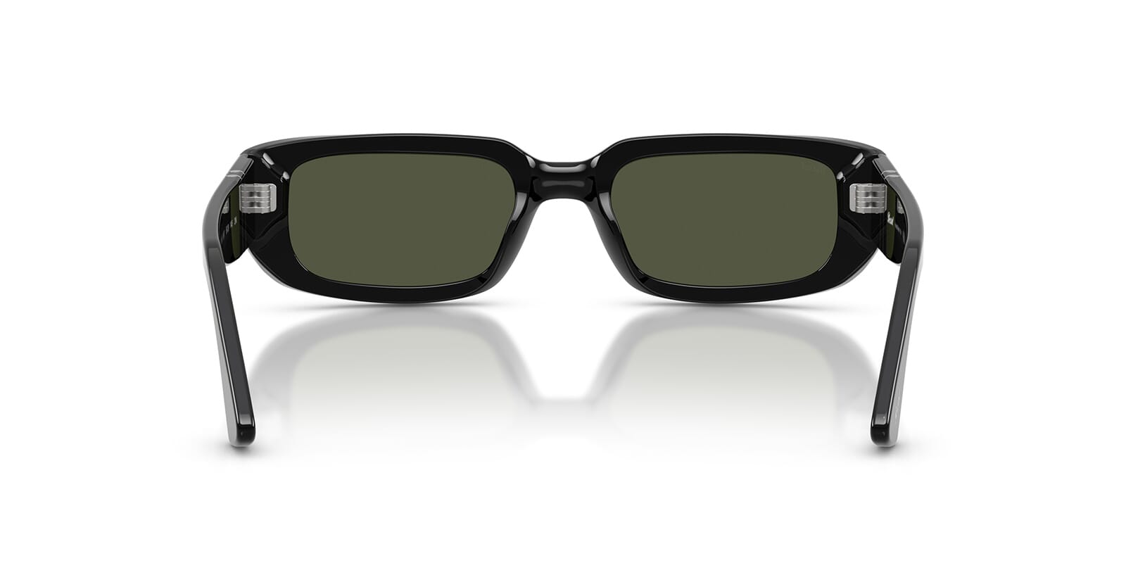 This rectangular Persol sunglass comes in a black frame with green lenses.