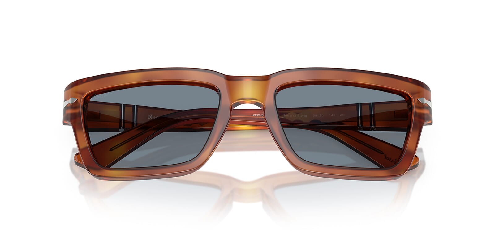 This rectangular Persol sunglass comes in a terra di siena frame with blue lenses.