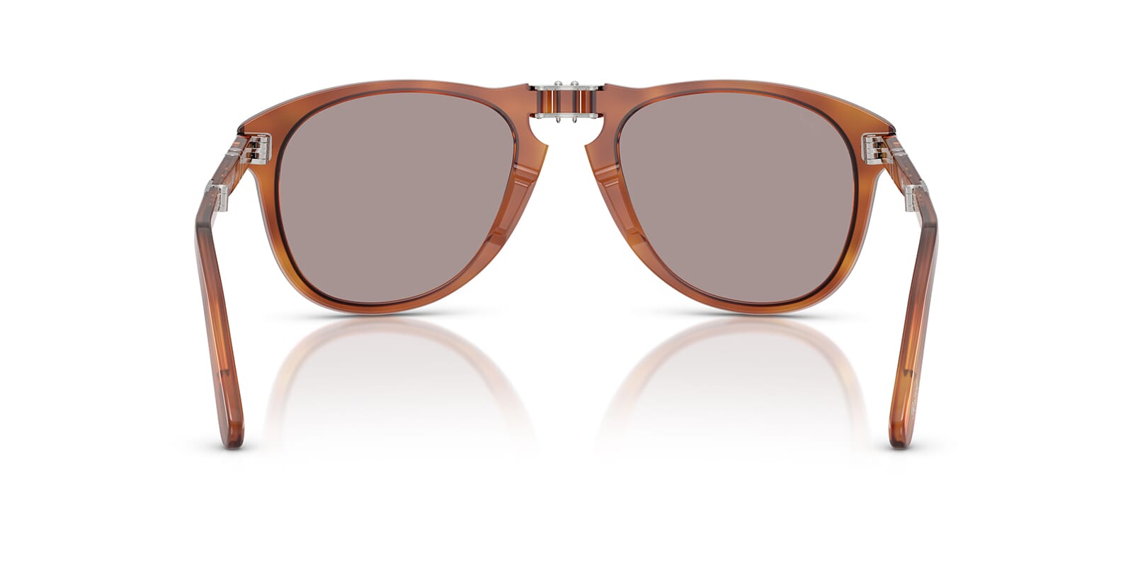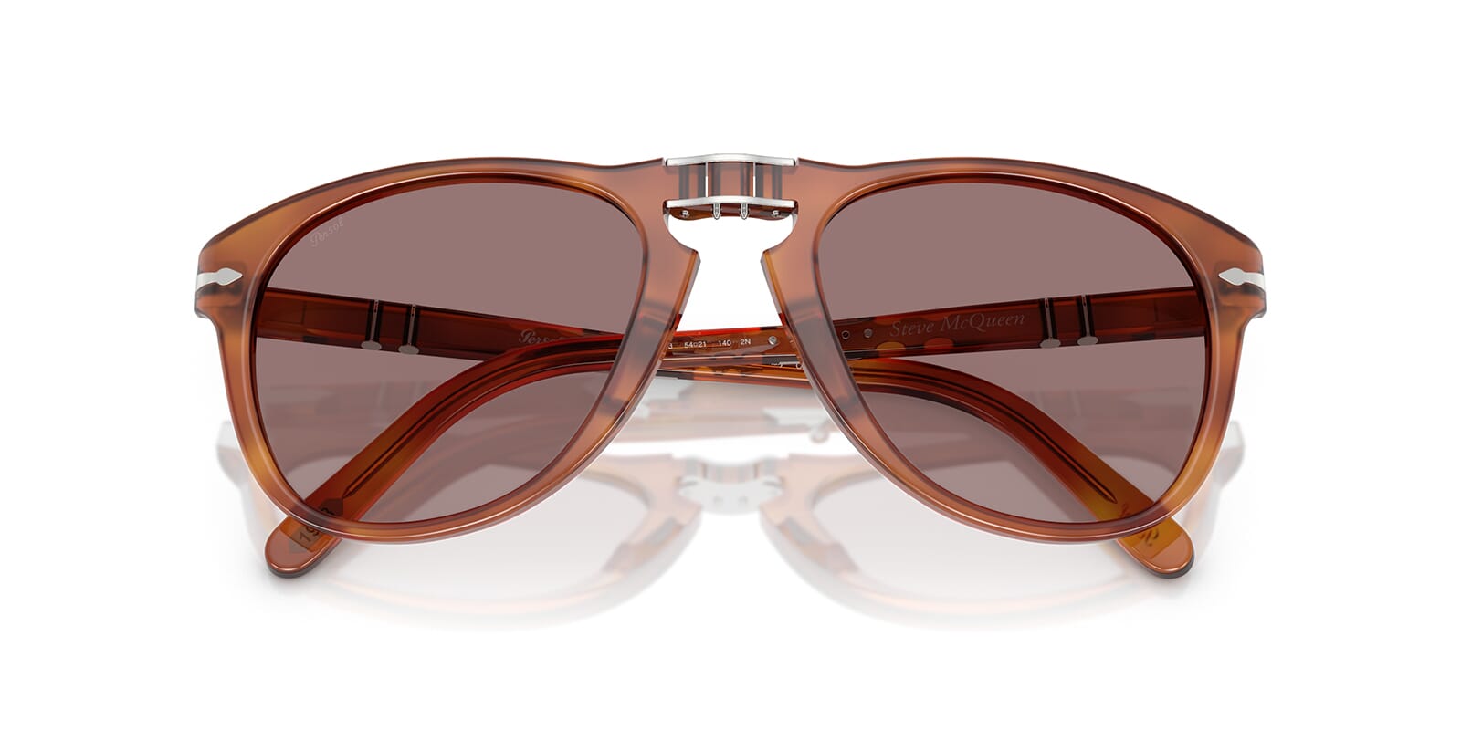 This aviator Persol sunglass comes in a terra di siena frame with violet lenses.