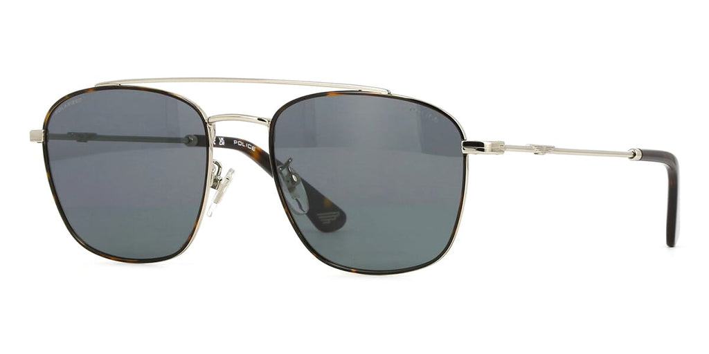 This square Police sunglass comes in a shiny dark havana and silver frame with grey with light mirror polarised lenses.