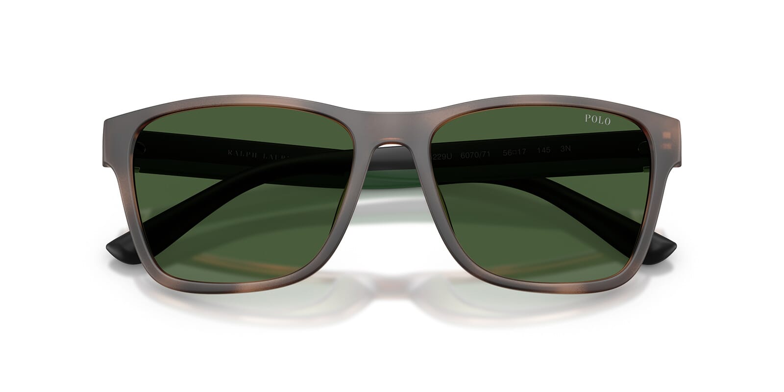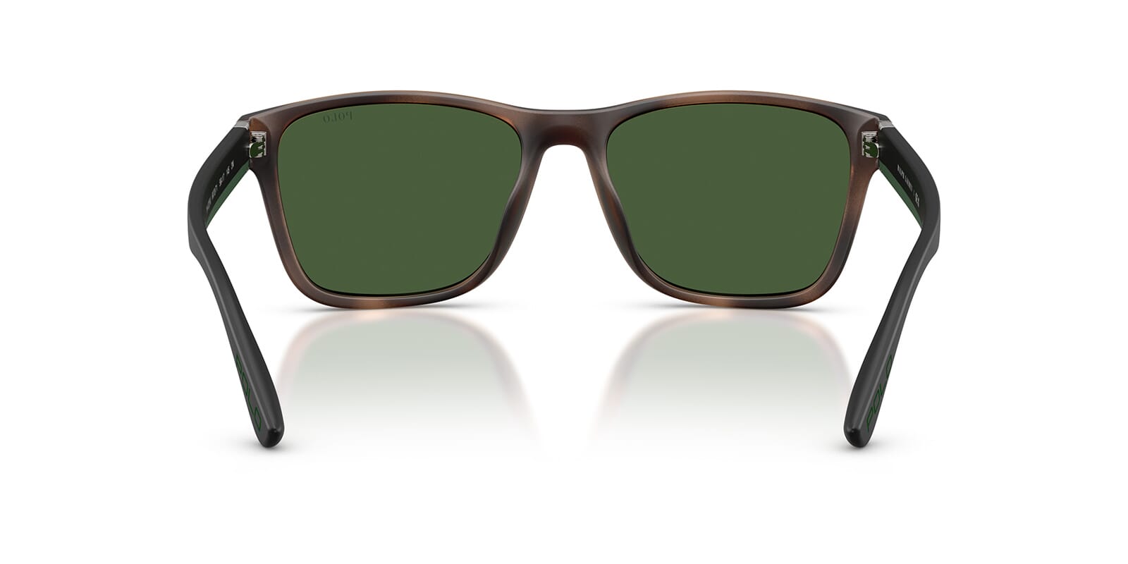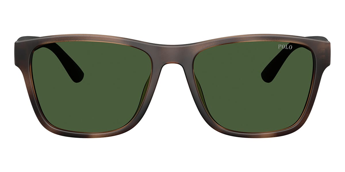 This square Polo sunglass comes in a matte dark havana frame with bottle green lenses.