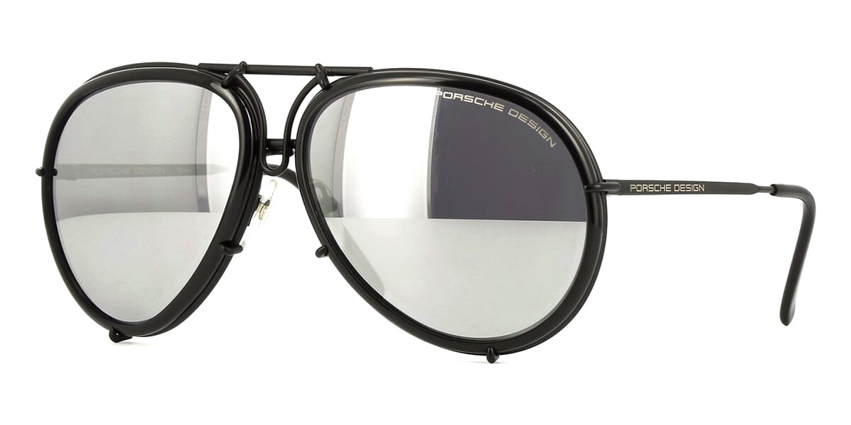 This aviator Porsche Design sunglass comes in a metallic black frame with grey with silver flash mirror lenses.