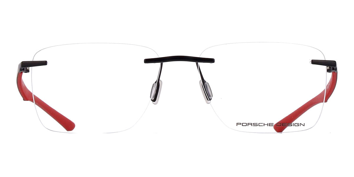 This square Porsche Design optical comes in a matte black and carbon fiber with red frame.