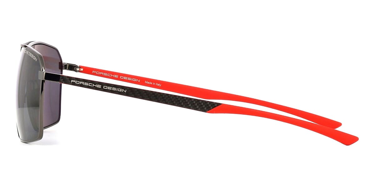 This aviator Porsche Design sunglass comes in a dark grey and red frame with grey with light mirror polarised lenses.