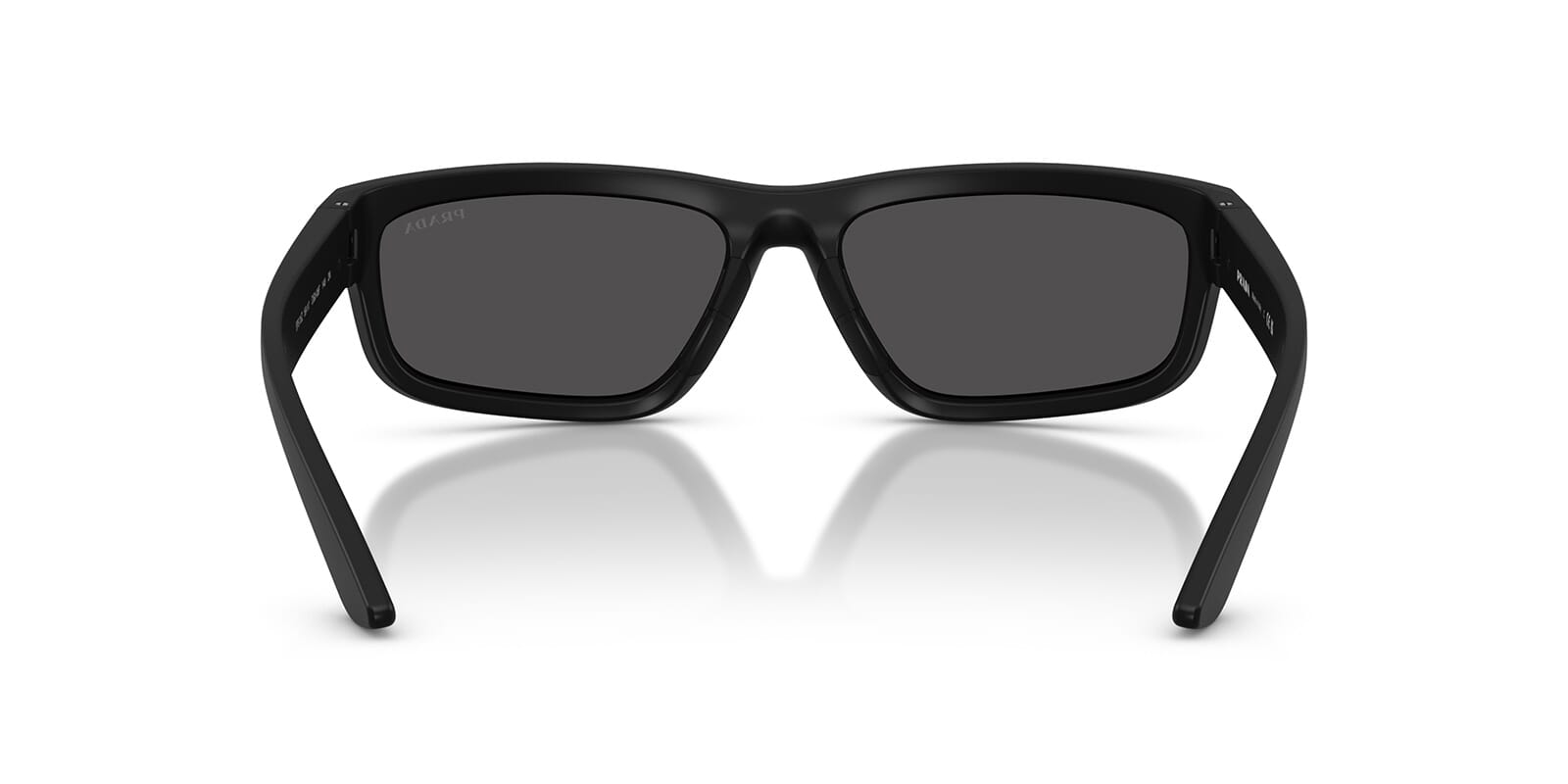 This rectangular Prada Linea Rossa sunglass comes in a black rubbered frame with dark grey lenses.