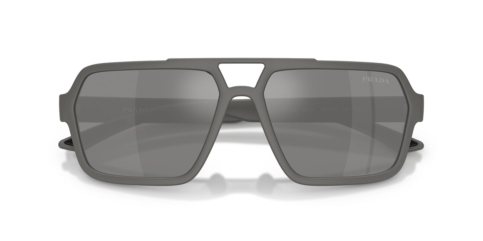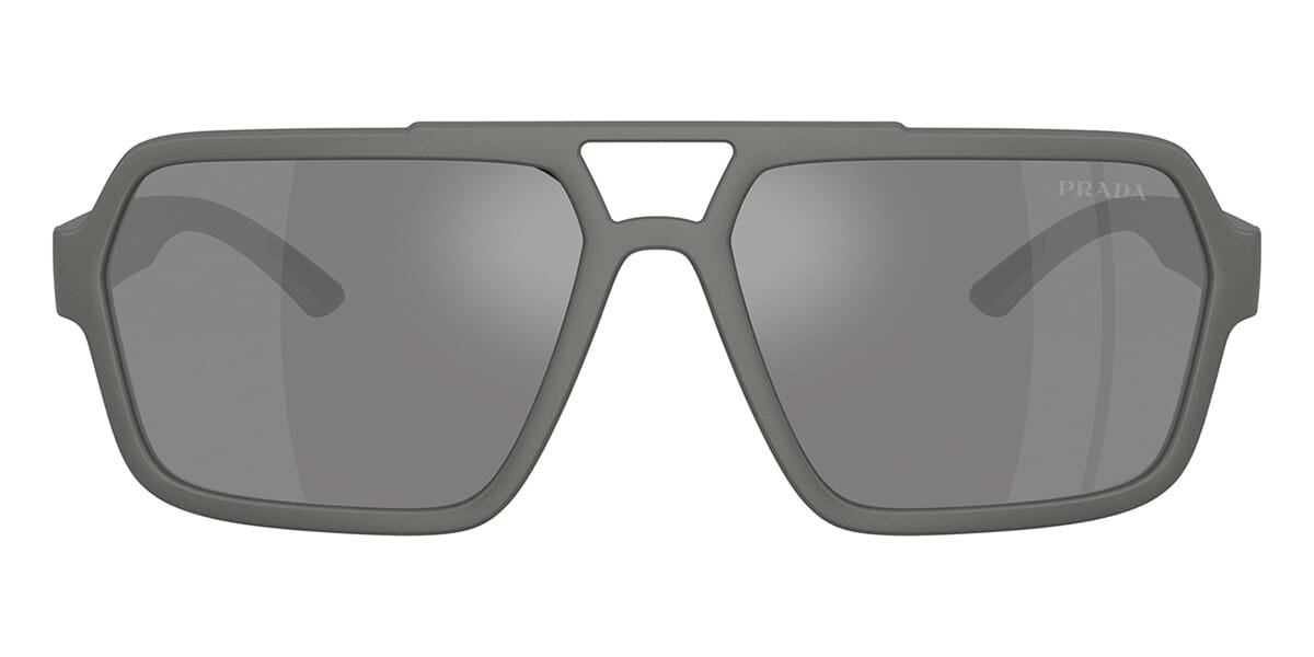 This aviator Prada Linea Rossa sunglass comes in a grey metal frame with grey with silver mirror lenses.