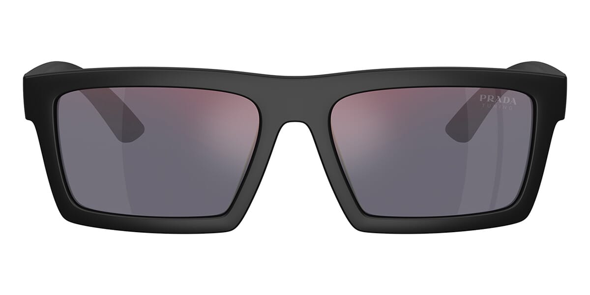 This rectangular Prada Linea Rossa sunglass comes in a matte black frame with dark grey with red tuning mirror lenses.