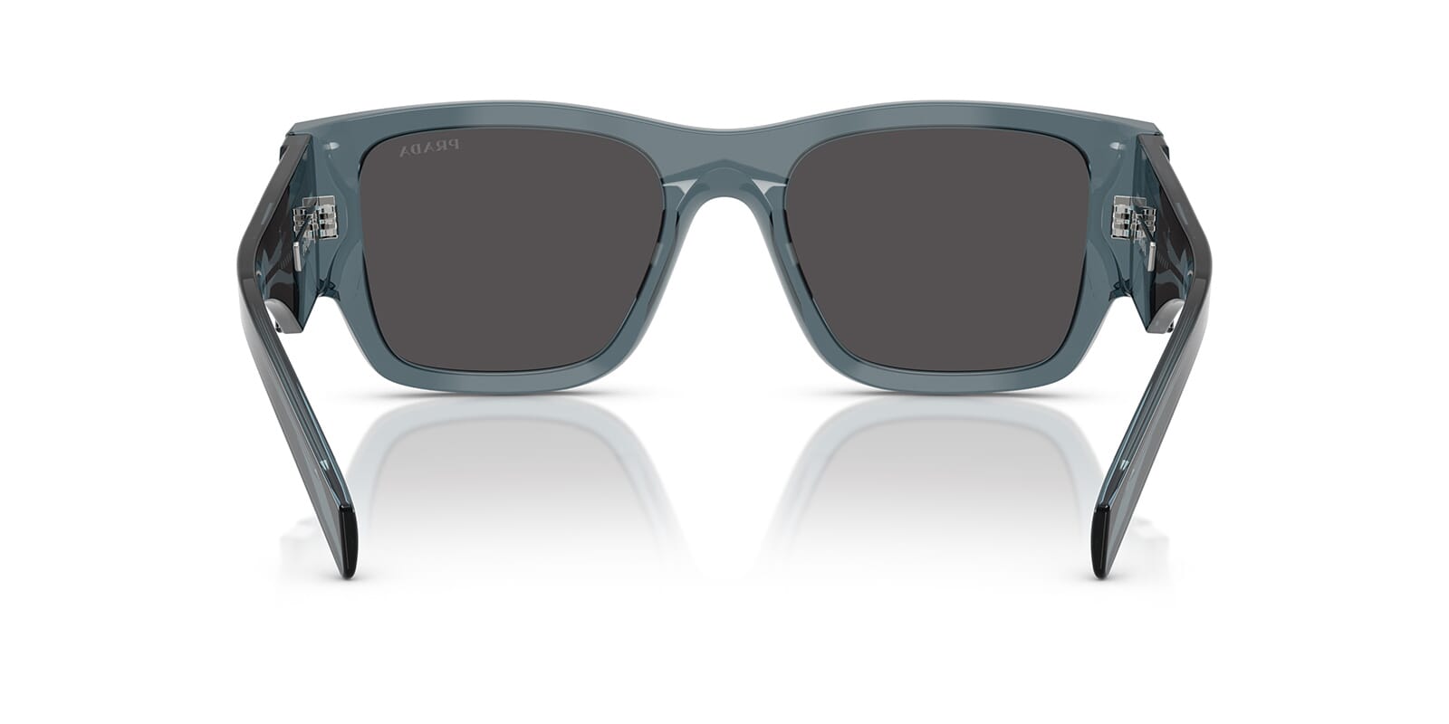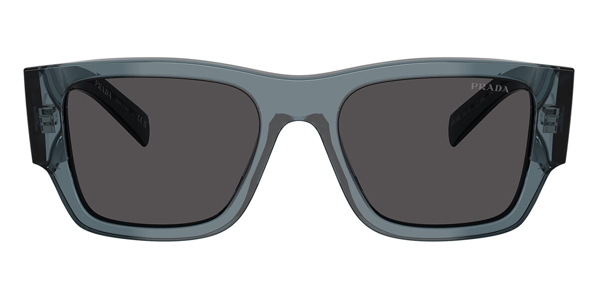 This square Prada sunglass comes in a ocean crystal frame with dark grey lenses.