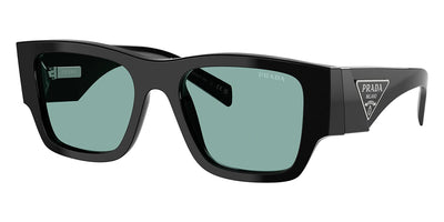 This rectangular Prada sunglass comes in a black frame with dark grey lenses.