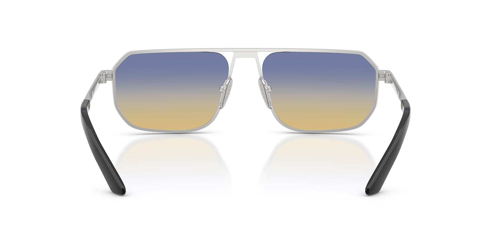 This rectangular Prada sunglass comes in a matte silver frame with yellow and dark blue lenses.